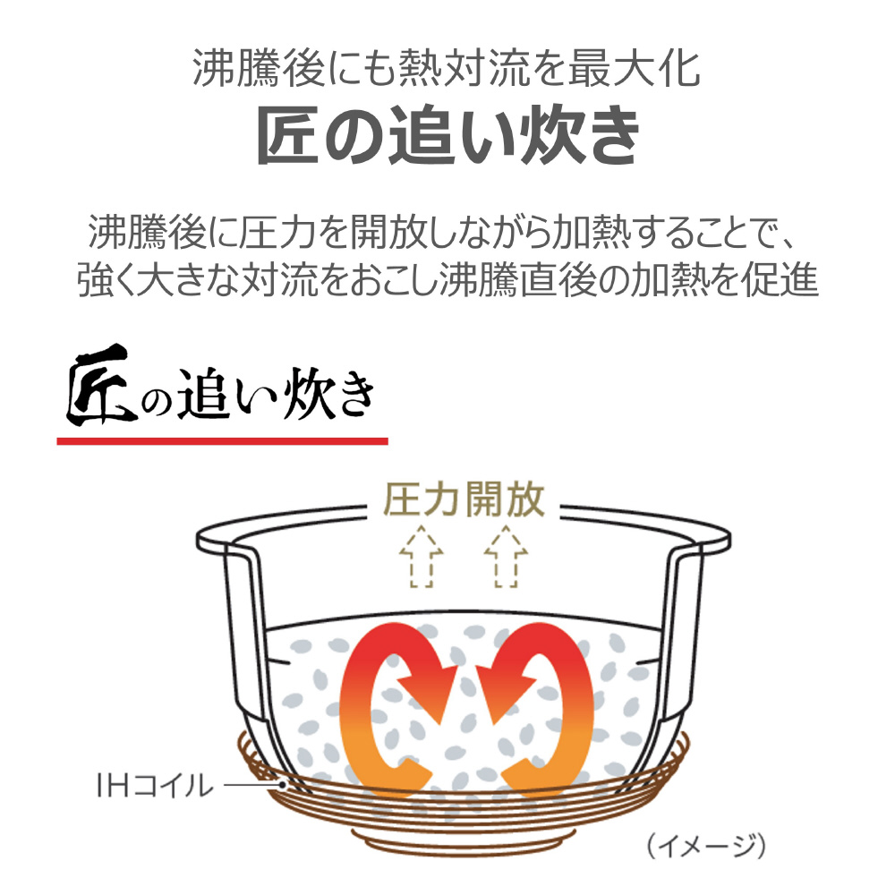 | 炊きあがりまでの時間 | 2合炊飯時目安/【白米】・「極匠」60分・「匠炊き」炊き分け5通り(28分〜48分)・「そくうま」24分・「冷凍ごはん」50分・「お弁当」60分・「炊込み」45分・「おかゆ(0.5合時)」65分・「エコ炊飯」45分 【玄米】・「匠炊き」(1合時)105分・「そくうま」(1合時)58分・おかゆ(0.5合時)80分 【麦ご飯】(1合時)45分 【雑穀米】(1合時)55分 |