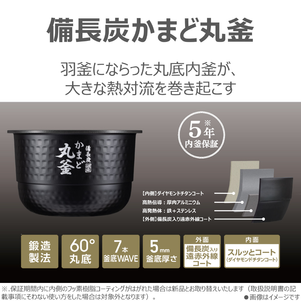 | 内釜仕様 | 鍛造内釜/外面コーティング:備長炭入り遠赤外線コート/内面コーティング:スルッとコート(ダイヤモンドチタンコート)/厚さ(釜底):5o/釜底WAVE:7本/内釜保証:フッ素樹脂コーティング5年保証 |