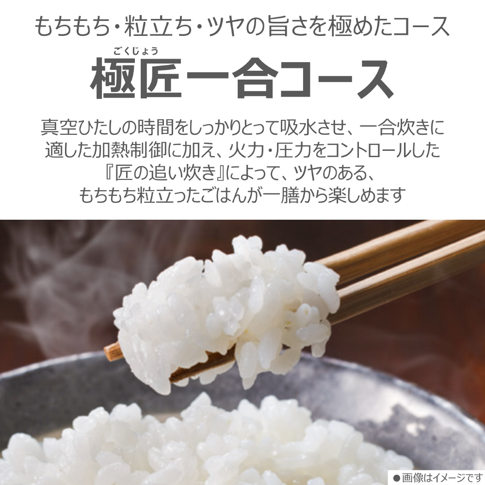 | メニュー | 白米/無洗米・極匠(ごくじょう)・匠炊き5通り・銘柄炊き分け(7銘柄)・そくうま/早炊き・エコ炊飯・極匠一合・おかゆ・炊き込み・お弁当・冷凍ごはん・白米玄米混合・玄米・麦ご飯/雑穀米 「調理コース」ゆで卵/半熟卵/温泉卵 |