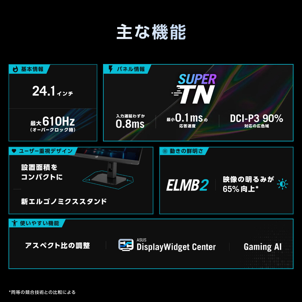 24.1インチのフルHD Super TNパネルを搭載し、最大610Hzの超高速リフレッシュレートと0.1msの応答速度を実現。ELMB 2やVRR、低遅延、DisplayHDR 400など、プロ仕様の機能を満載。三脚用ソケットやDisplayWidget Center、HDMI 2.1にも対応。