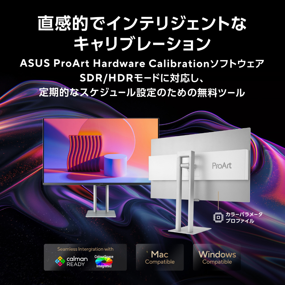 ASUS ProArt Hardware Calibrationソフトウェアは、SDR/HDRモードの両方に対応しています。すべてのカラーパラメータプロファイルは、PCではなくProArtモニターの内蔵スケーラーICチップに直接保存されます。 また、 ProArt Calibrationではスケジュールを組み、定期的にキャリブレーションを実行することも可能です。