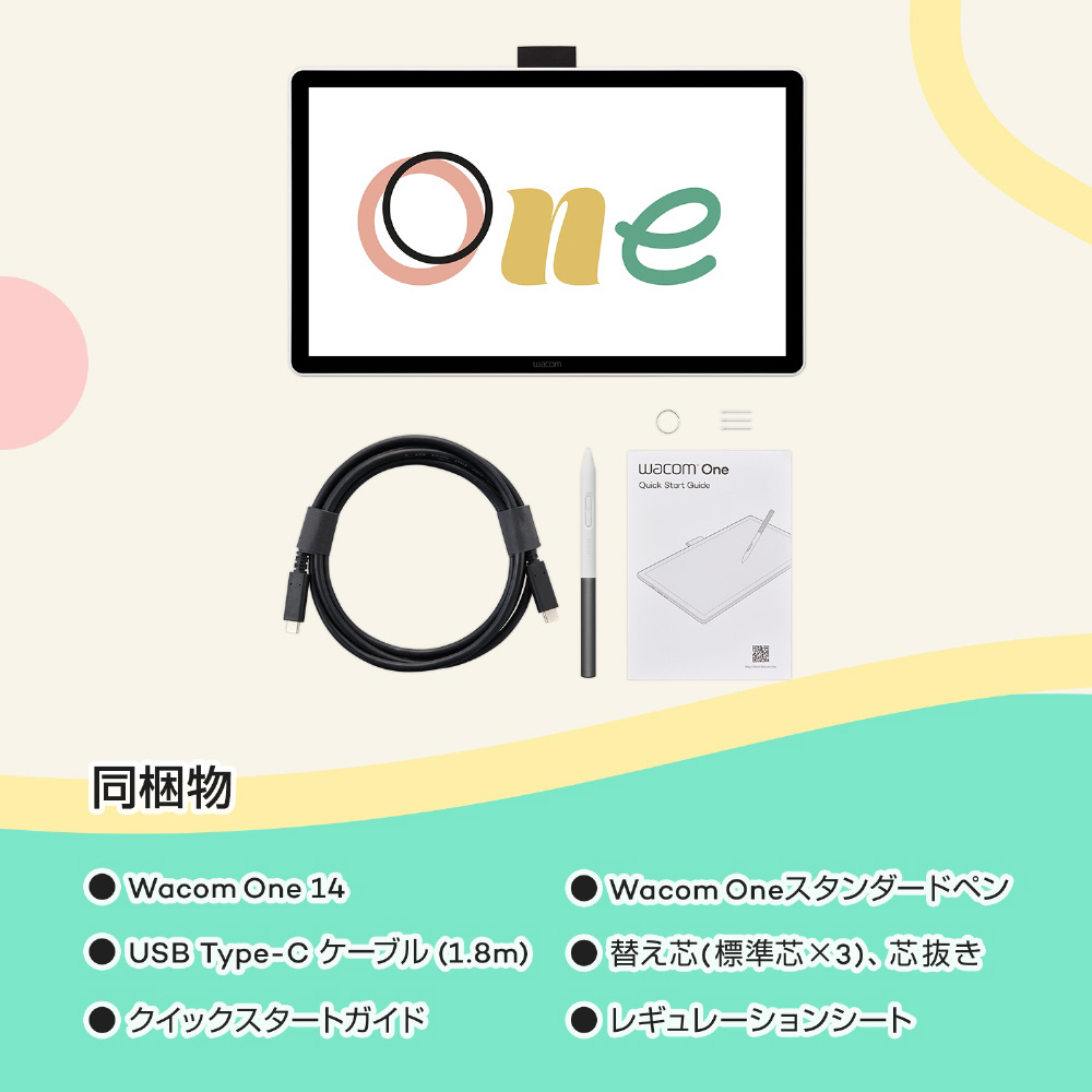 | 付属品 | Wacom Oneスタンダードペン 替え芯(標準芯3本) 芯抜き USB Type-Cケーブル (1.8m)×1本 クイックスタートガイド IPIブックレット (重要な製品情報) |