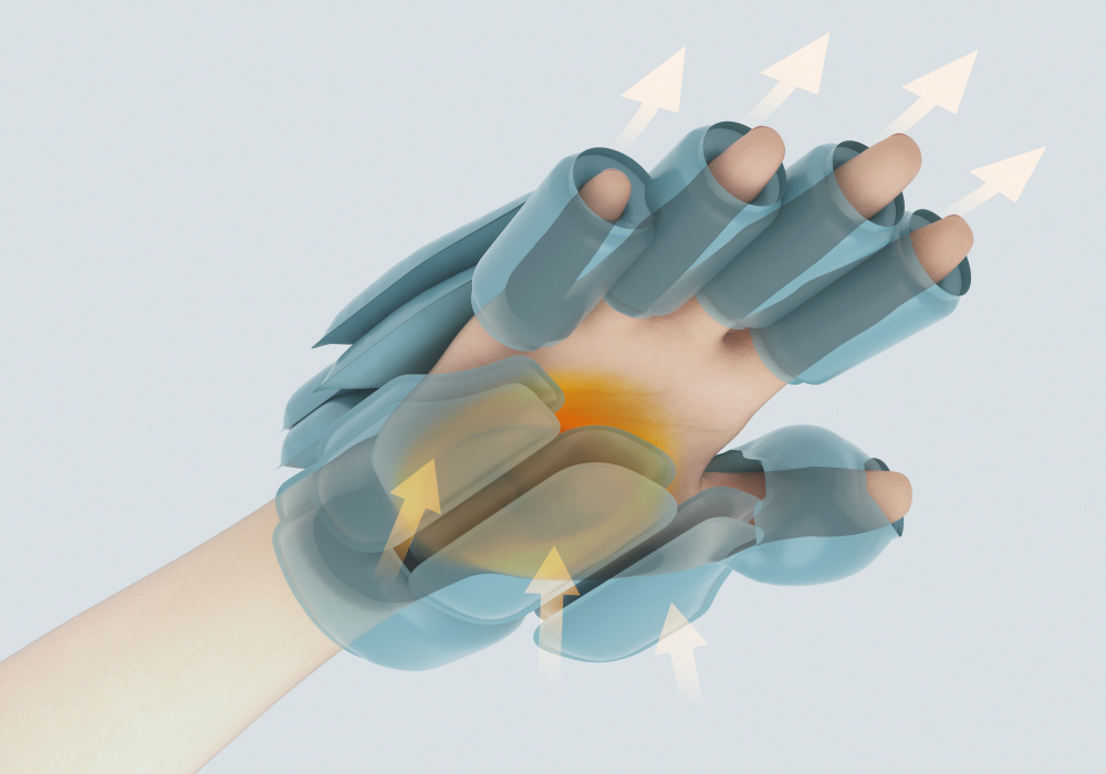 エアバッグが前方に移動して指を引っぱり、空気を抜いてパッと解放。指や手がスッキリします。
