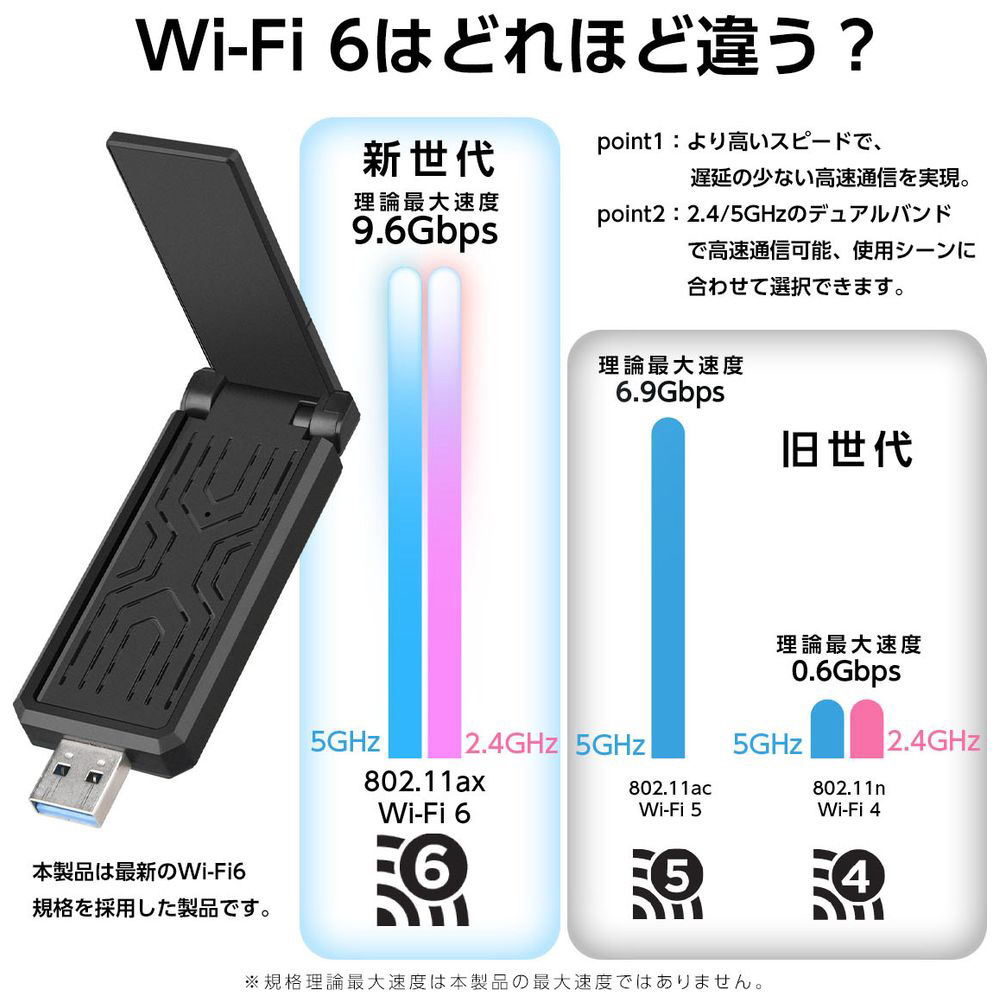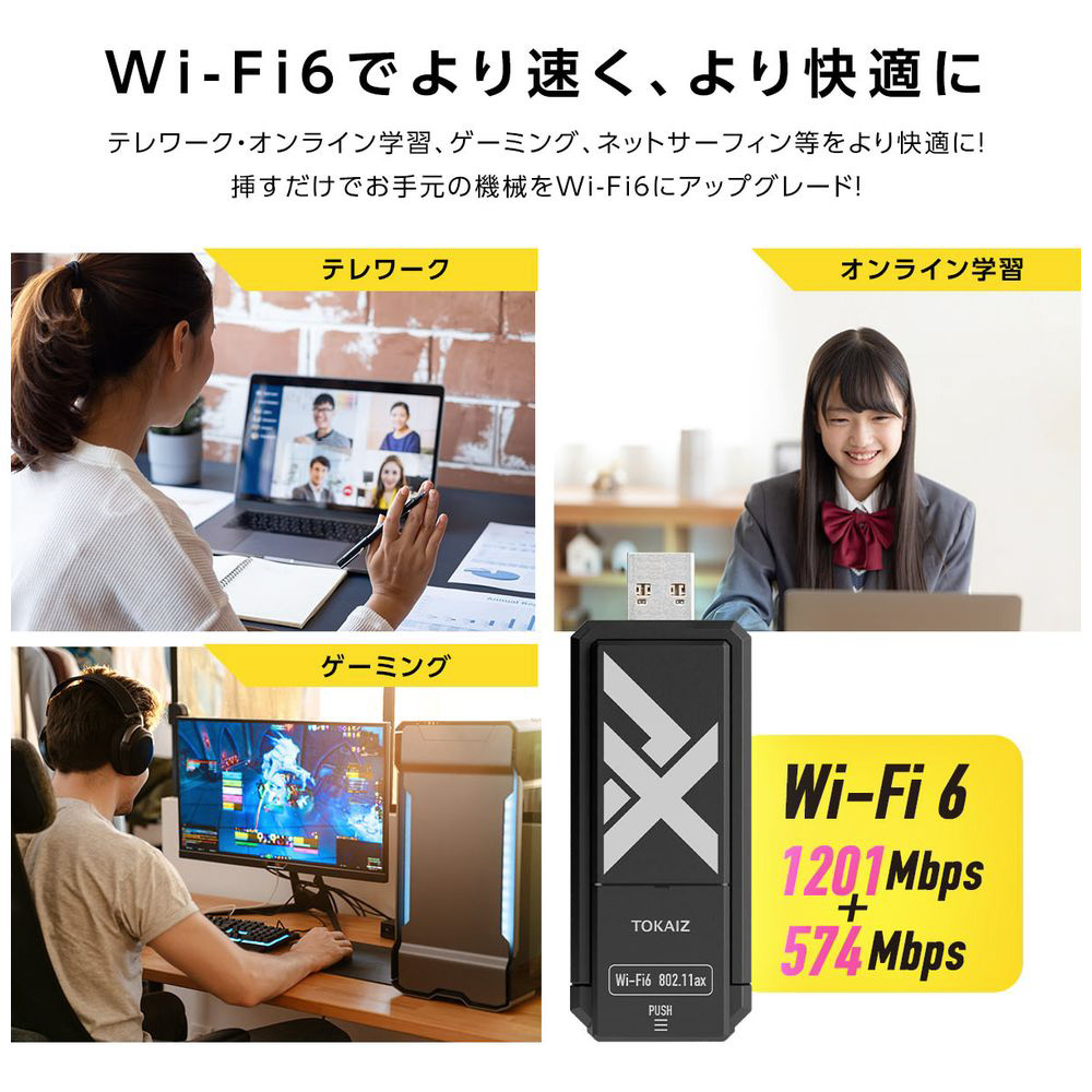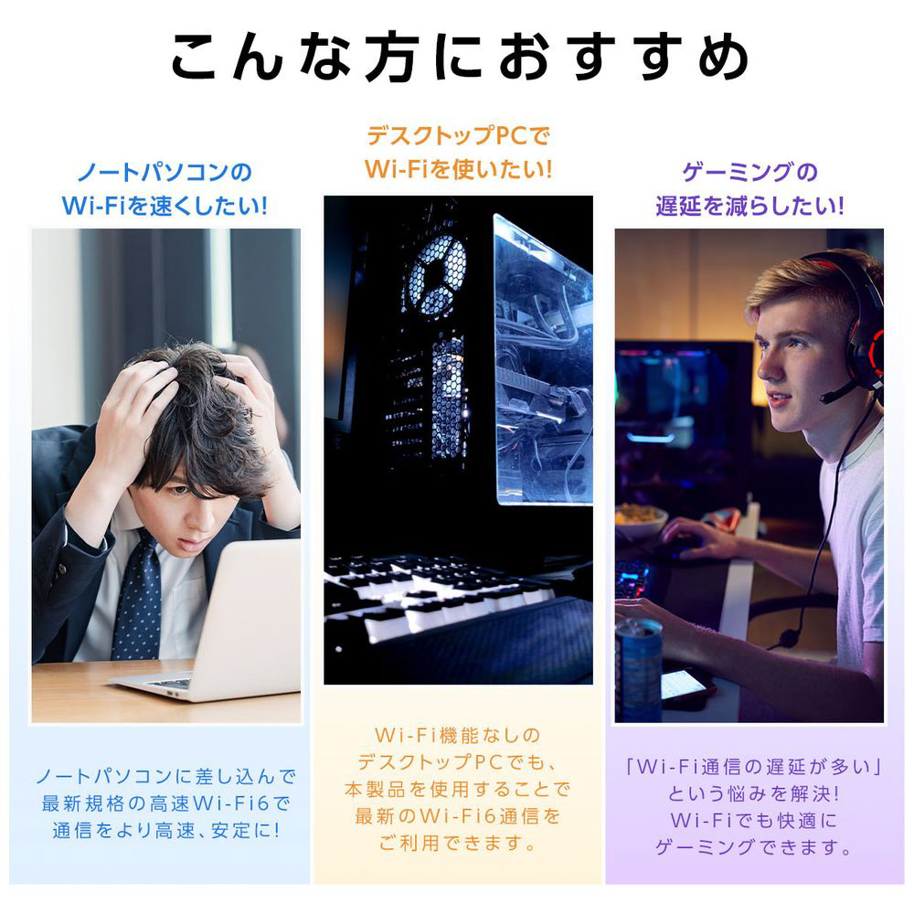 USB3.2対応の超高速AX1800(1201Mbps+574Mbps)、2.4GHz+5GHz対応でAX Wi-Fi6までサポート。無線設備適合認証済み&日本語説明書付きで安心して使えるWi-Fiアダプター。