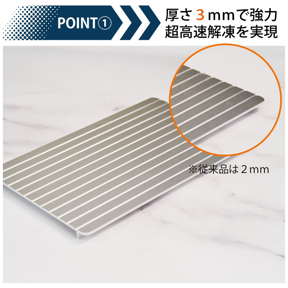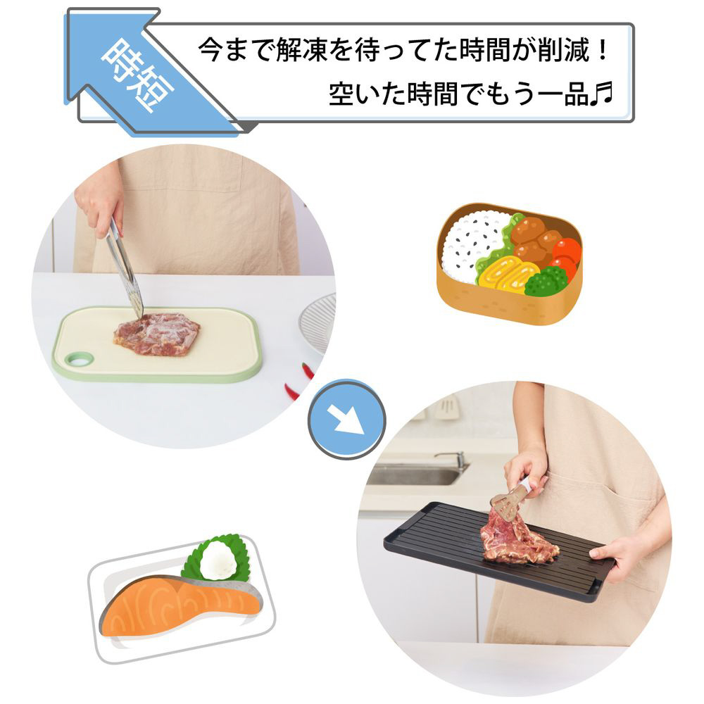 電気不要で省エネ!解凍プレートは12倍速で肉・魚・野菜を瞬時に解凍し、美味しさを逃さずキープ。出た水はサッと付属のトレーに流せて後片付けも簡単。