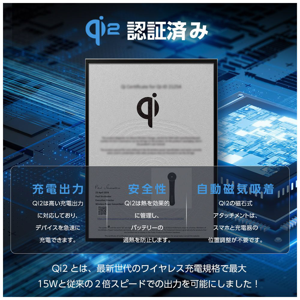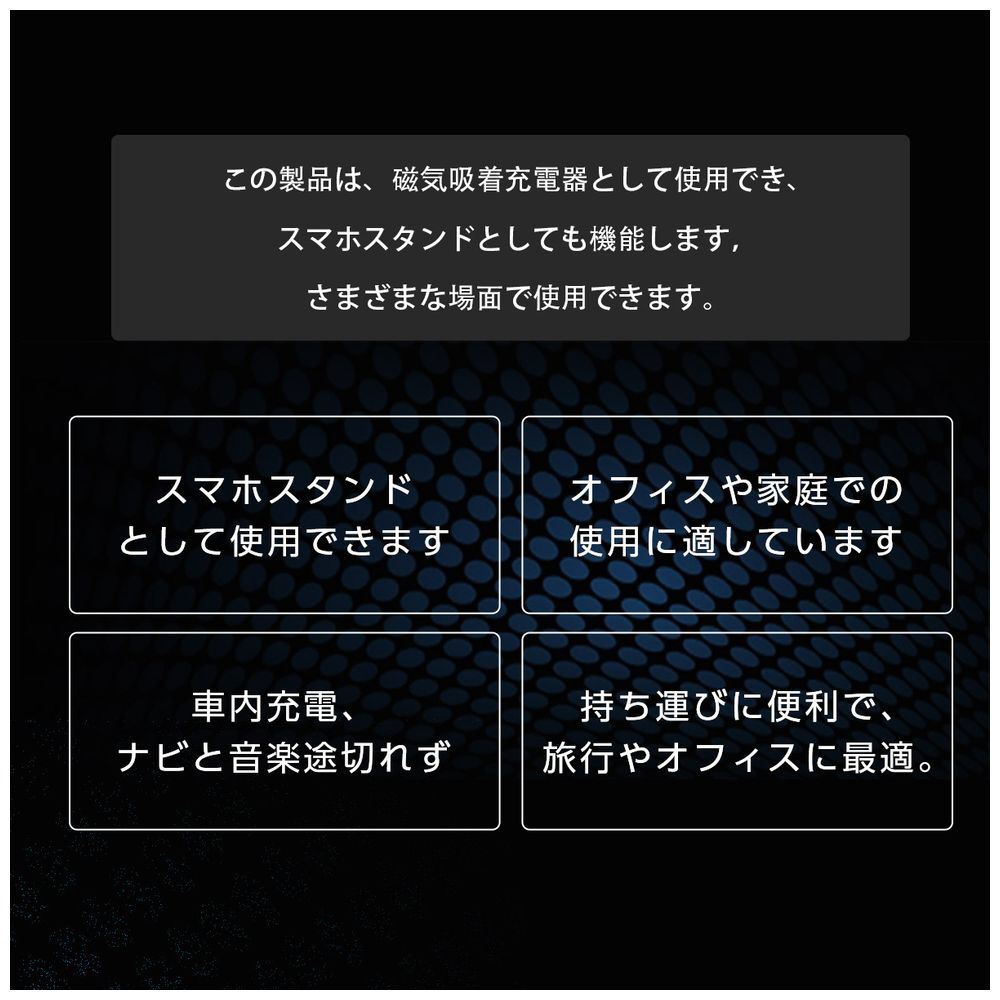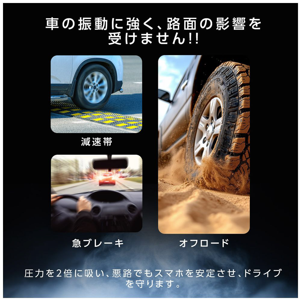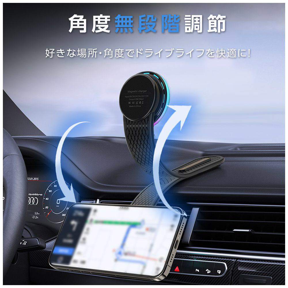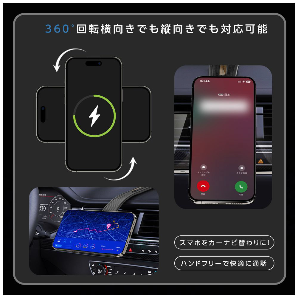 Qi2対応、15W急速充電&52N超強力磁石でスマホをしっかり安定保持。片手操作で地図確認もラクラク、設置場所を選ばず角度も自由に調整でき、快適なドライブをサポートします。