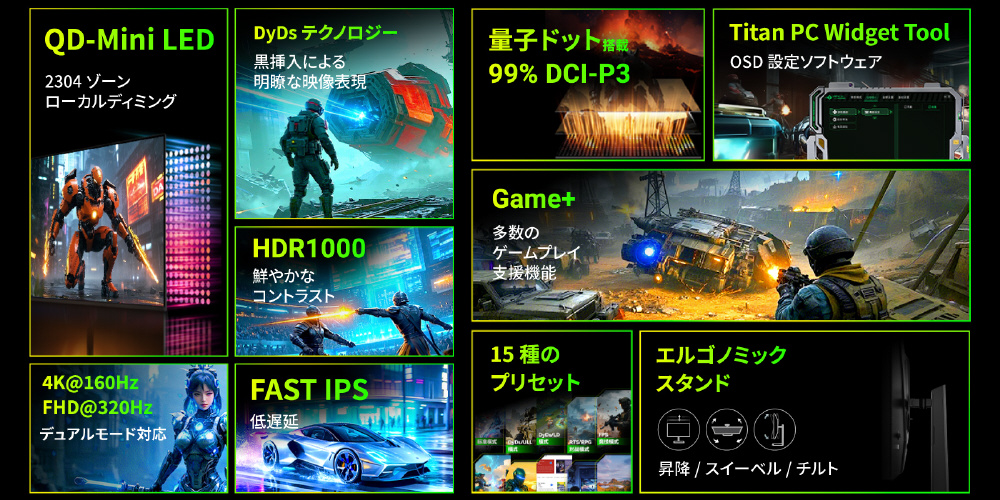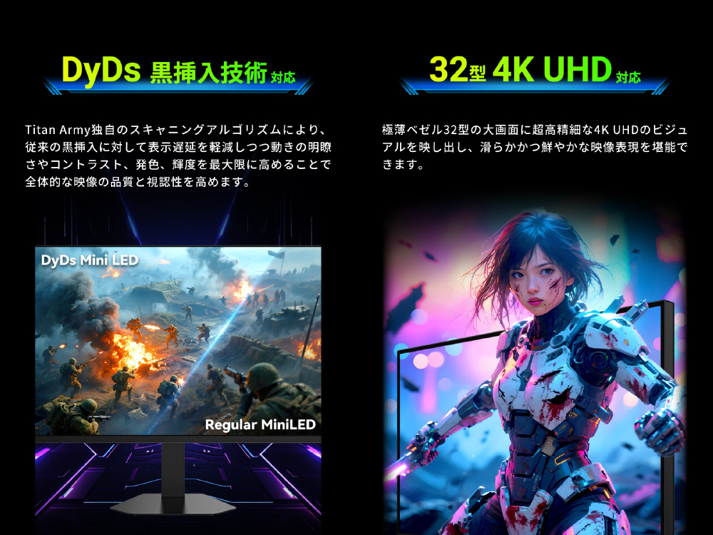 Titan Army P326MV MAXはMini LED、量子ドット技術を搭載し2304ゾーンのローカルディミングに対応した32型160Hz対応のハイエンドゲーミングモニターです。4K(3840×2160)の高解像度とDCI-P3 99%、Adobe RGB 99%の広色域に対応します。最大1000nits(ピーク値)の超高輝度によりHDR1000相当の性能を持ち、2304ゾーンのローカルディミングは従来のバックライトに比べ、光漏れを抑制しはっきりとした黒色を再現します。4K@160Hzだけでなく、デュアルモードによりFHD@320Hzでの超高リフレッシュレートでの動作にも対応し、素早いゲームプレイを実現します。HDMI 2.1ポートを2つ備え、最新の家庭用ゲーム機において4K 120Hz出力でのプレイ、VRR(可変リフレッシュレート機能)にも対応しています。また、独自のDyDs(ダイナミックディスプレイ)モードを備え、高リフレッシュレート時の残像感、ブレを低減し更に明瞭な動画表現が可能です。