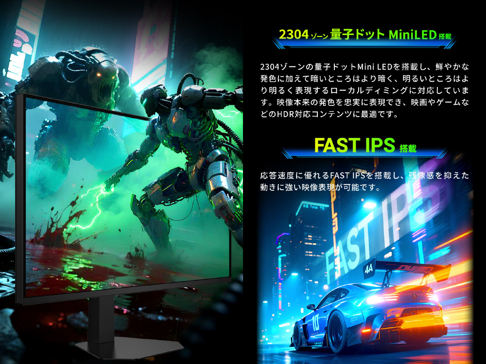 2304ゾーンの量子ドットMini LEDを搭載し、鮮やかな発色に加えて暗いところはより暗く、明るいところはより明るく表現するローカルディミングに対応しています。