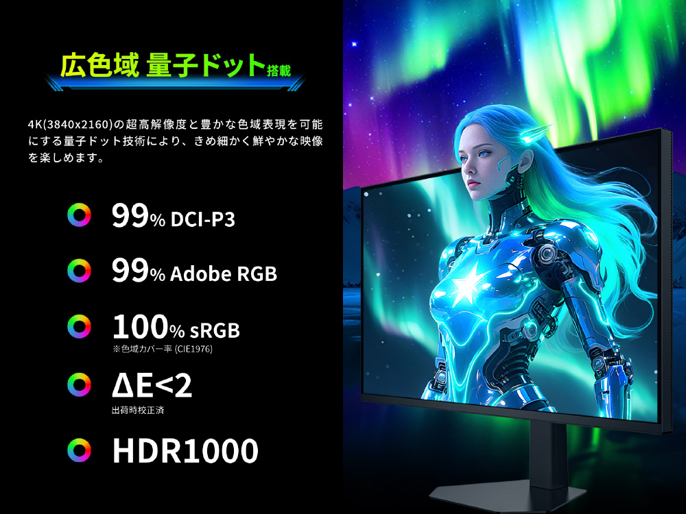 量子ドット技術により従来のモニターでは弱点だった緑や赤の発色を改良し、DCI-P3 99%、Adobe RGB 99%の広色域に対応、ゲームプレイのみならず画像編集、動画編集にも最適です。