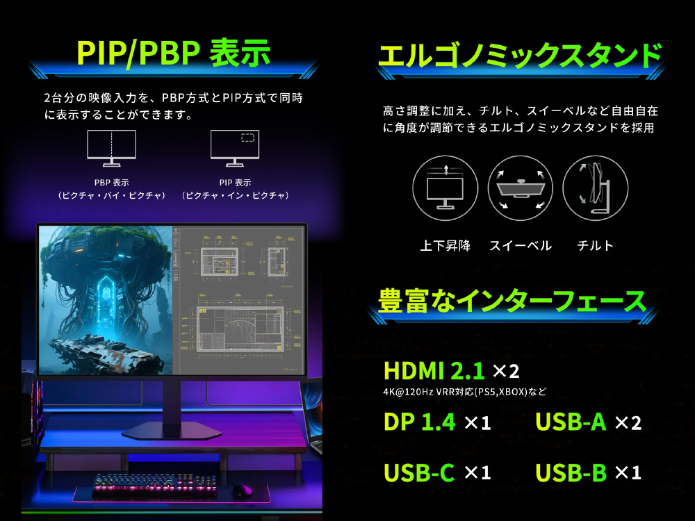 2台のPCやゲーム機を分割表示するPBP/PIP方式に対応し、左右2分割や親画面/子画面に分割して2つの映像を同時に表示することができます。