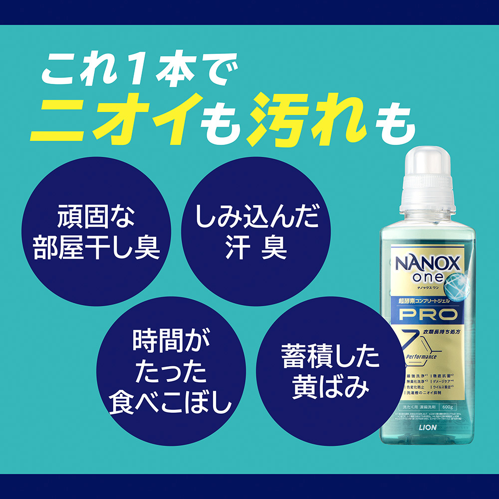 NANOX史上初の新酵素配合で、頑固な部屋干し臭、しみこんだ汗臭、時間がたった食べこぼし、蓄積した黄ばみまで解決!それだけでなく、黄ばみ・黒ずみ・くすみの発生を抑制し、色あせも防ぐ、衣類長持ち処方。