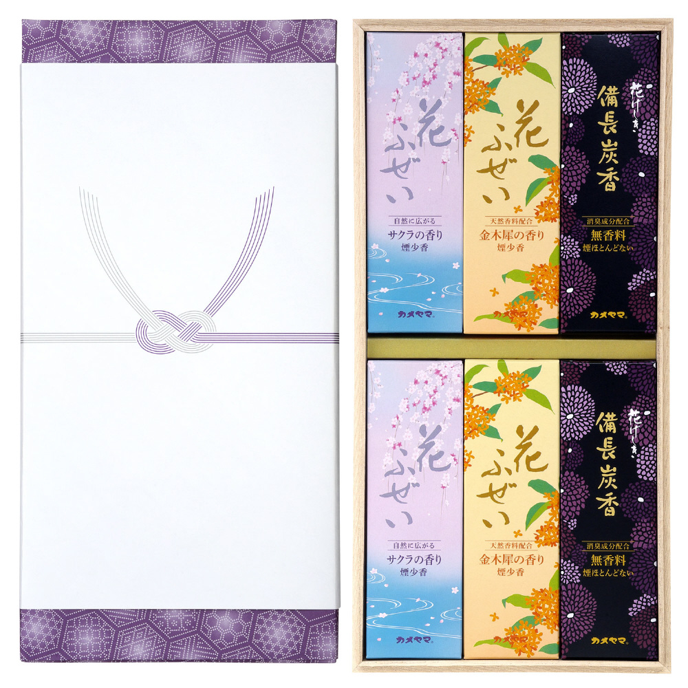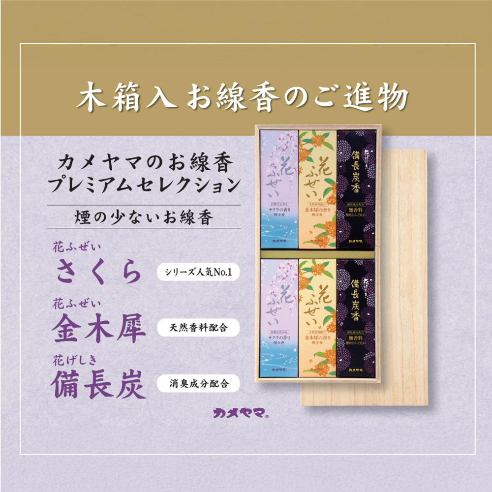 花ふぜいシリーズの人気の香り「さくら」「金木犀」に、活性炭と消臭成分を配合した「花げしき備長炭」を組み合わせた、高級感あふれる木箱入りのご進物です。