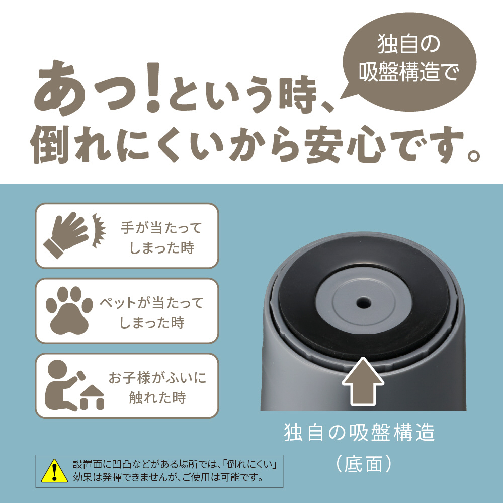独自の吸盤構造で「あっ!」という時、倒れにくいから安心。