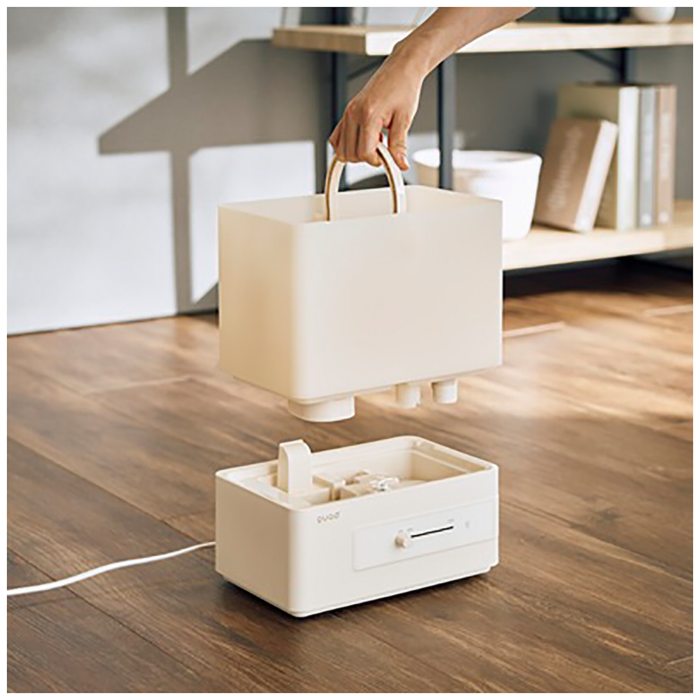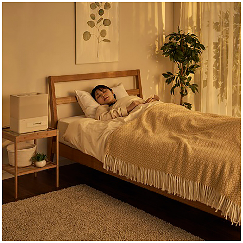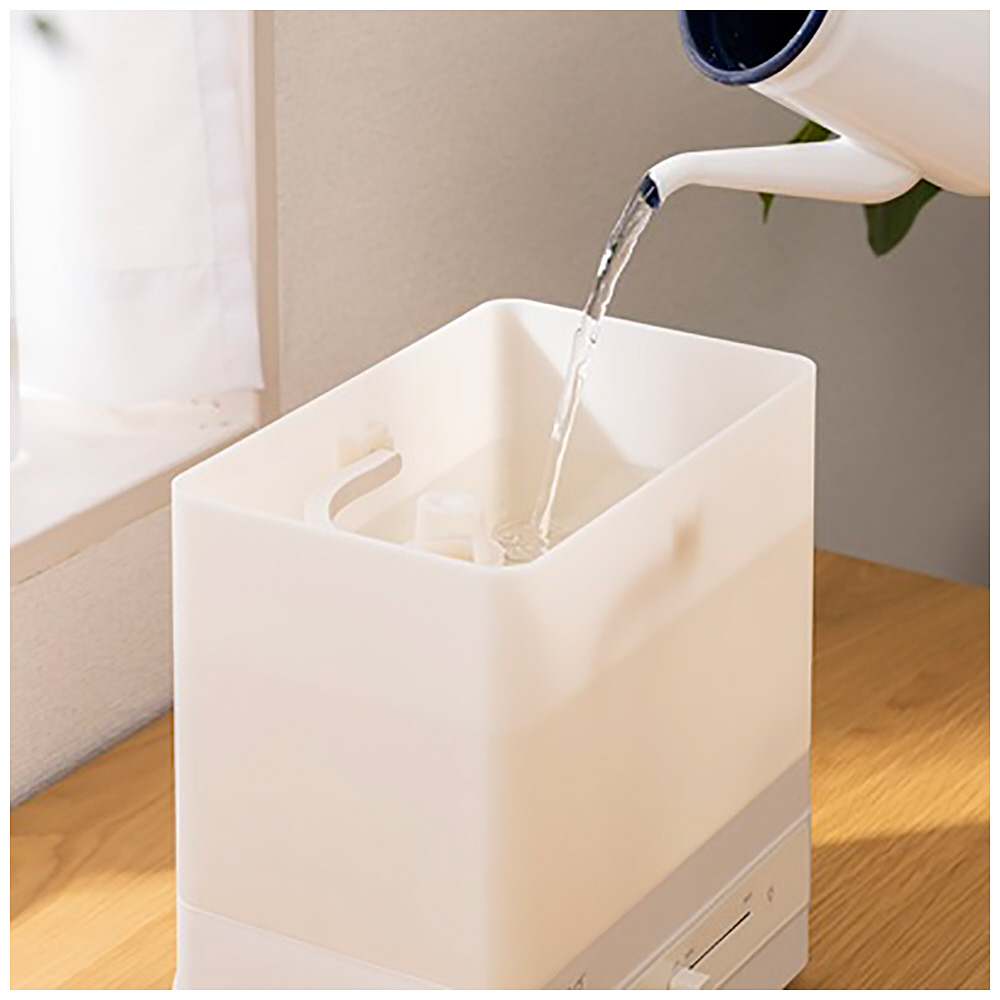 上部給水口付きの蓋を新たに採用したことで、タンクを外さずそのまま給水できる超音波式加湿器。約4Lの大容量タンクはハンドル付きで持ち運びも簡単。無段階で加湿量を調節でき、最大約260ml/hのミストで木造4畳・プレハブ7畳までしっかり加湿します。抗菌カートリッジで清潔に、専用トレイでアロマも楽しめる快適仕様です。