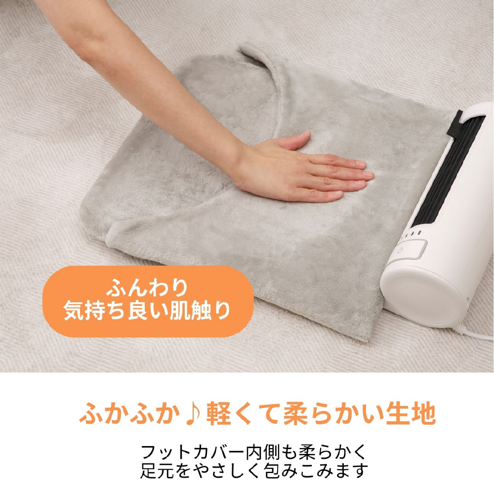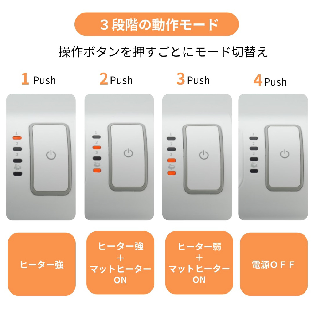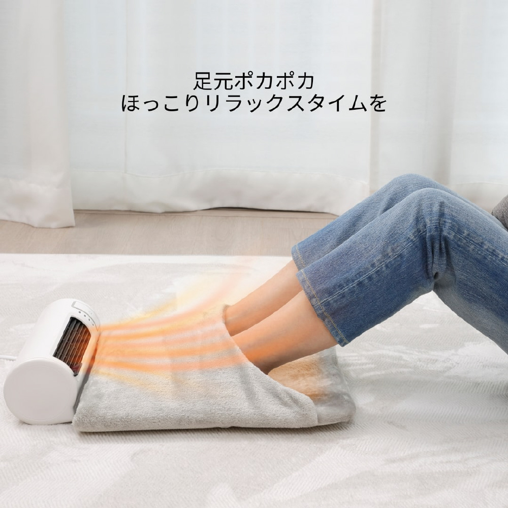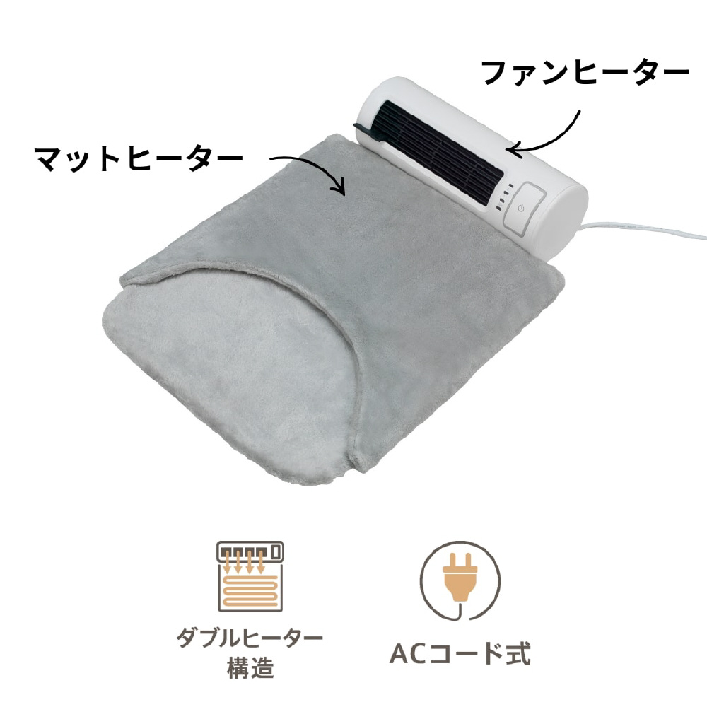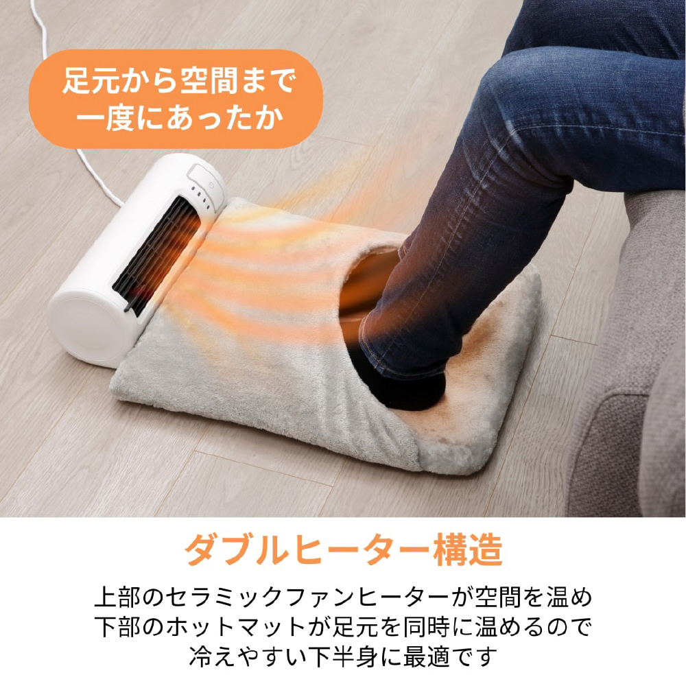 上部のセラミックファンヒーターが空間を温め下部のホットマットが足元を同時に温めます