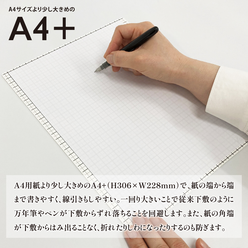 ●書き心地を追求するために厚みや硬度、質感など品質についてディテールに至るまで精巧にこだわっています。<BR>●黒方眼は正確な基準線ではっきりしたコントラストを表現するために1枚1枚を手作業で印刷しています。