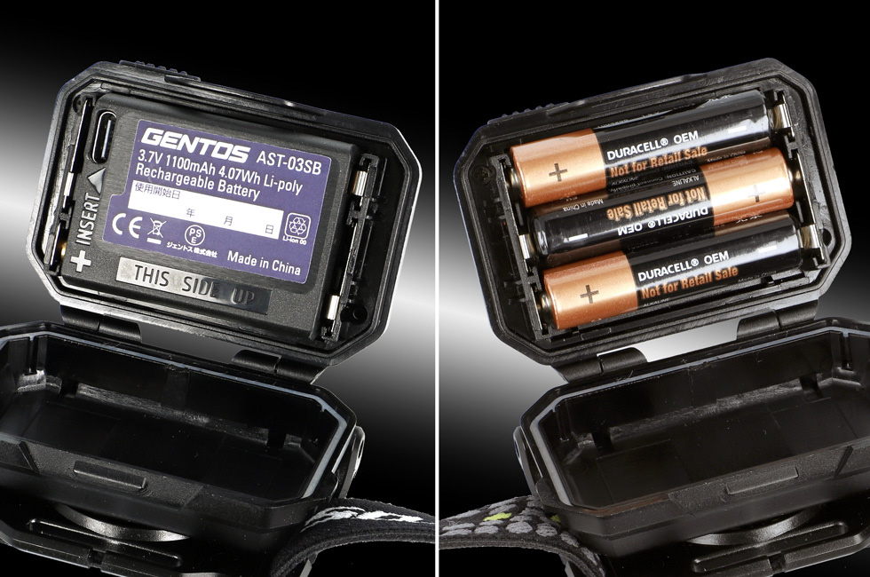 ■専用充電池と単4×3本のハイブリッド。