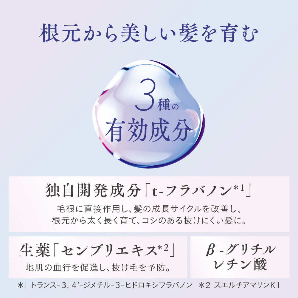 ●独自開発成分「t−フラバノン*1」毛根に直接作用し、髪の成長サイクルを改善し、根元から太く長く育て、コシのある抜けにくい髪に。●生薬「センブリエキス*2」地肌の血行を促進し、抜け毛を予防。●炭酸(噴射剤)の力で地肌に届く。●爽やかなアロマティックフローラルの香り *1 トランス−3,4´−ジメチル−3−ヒドロキシフラバノン *2 スエルチアマリンKI