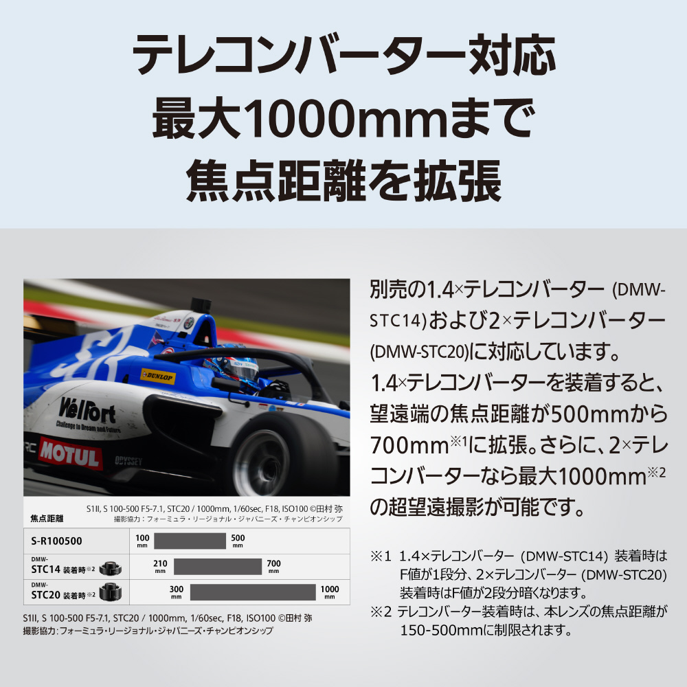 (※2)デジタルカメラ交換レンズ用テレコンバーター DMW-STC20装着時。テレコンバーター装着時は、本製品の焦点距離が150-500mmに制限されます。