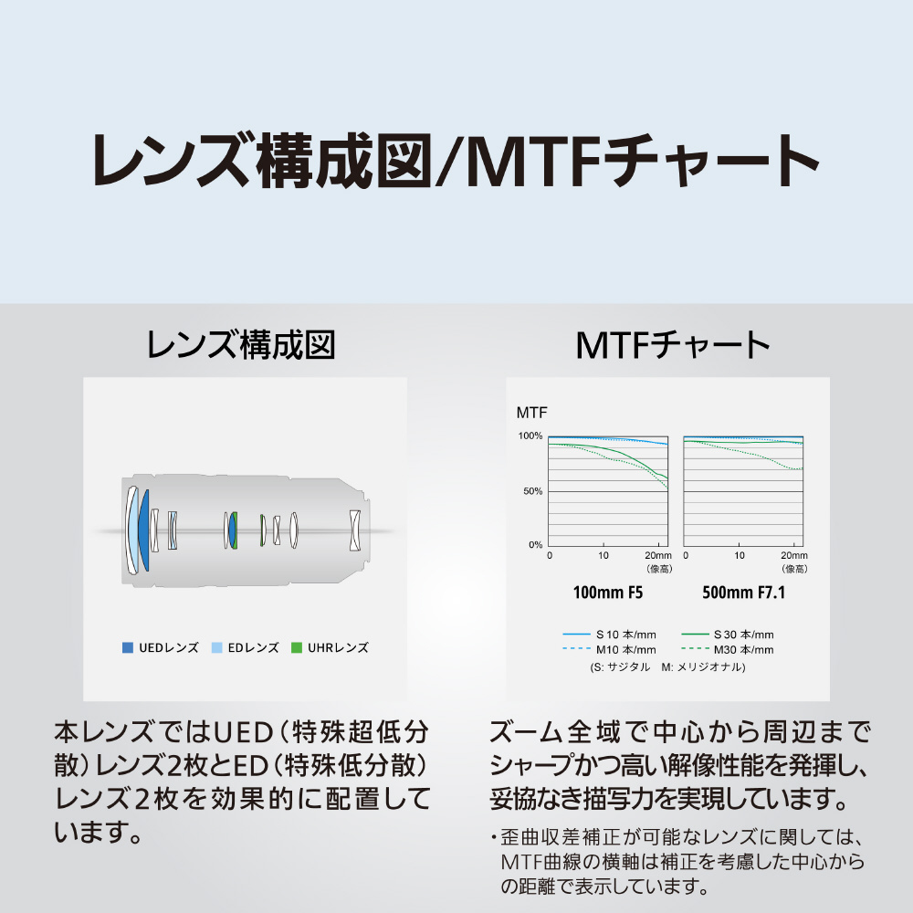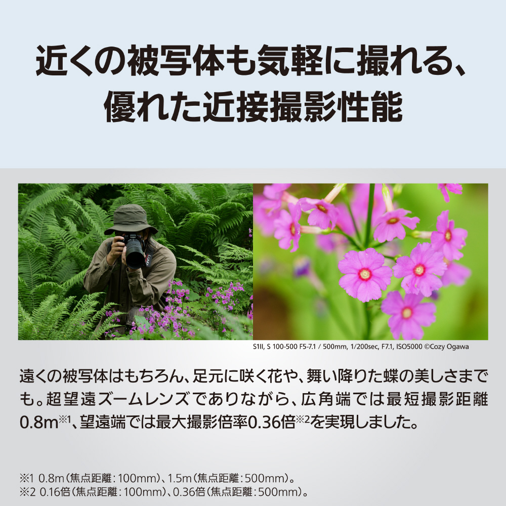 ・焦点距離100mmから500mmまでをカバー。別売テレコンバーター(※2)の装着で最長1000mm(※3)の撮影が可能