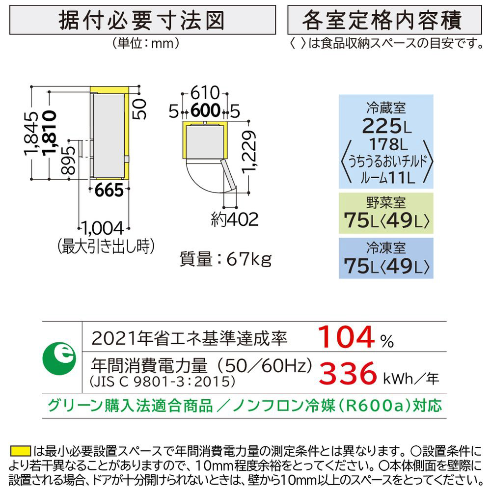 シンプルデザインのスリム幅60cm「まんなか野菜」。乾燥を抑える「うるおいチルド」「うるおい野菜室」。食品を急いで冷やしたいときに便利「サッと急冷却」。