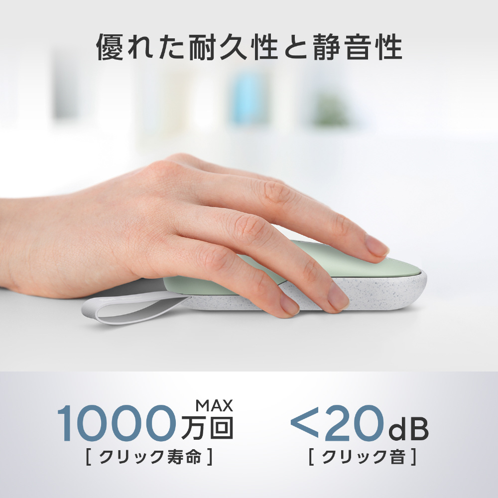 耐久性と静音性に優れたマウスです。スイッチには高耐久なものを使用しており、そのクリック寿命は最大1000万クリックを誇ります。これは従来の一般的なマウスの約3倍です。また、クリック音を20dB未満に抑えた静音設計なので、静かな環境でも気兼ねなく使用することができます。