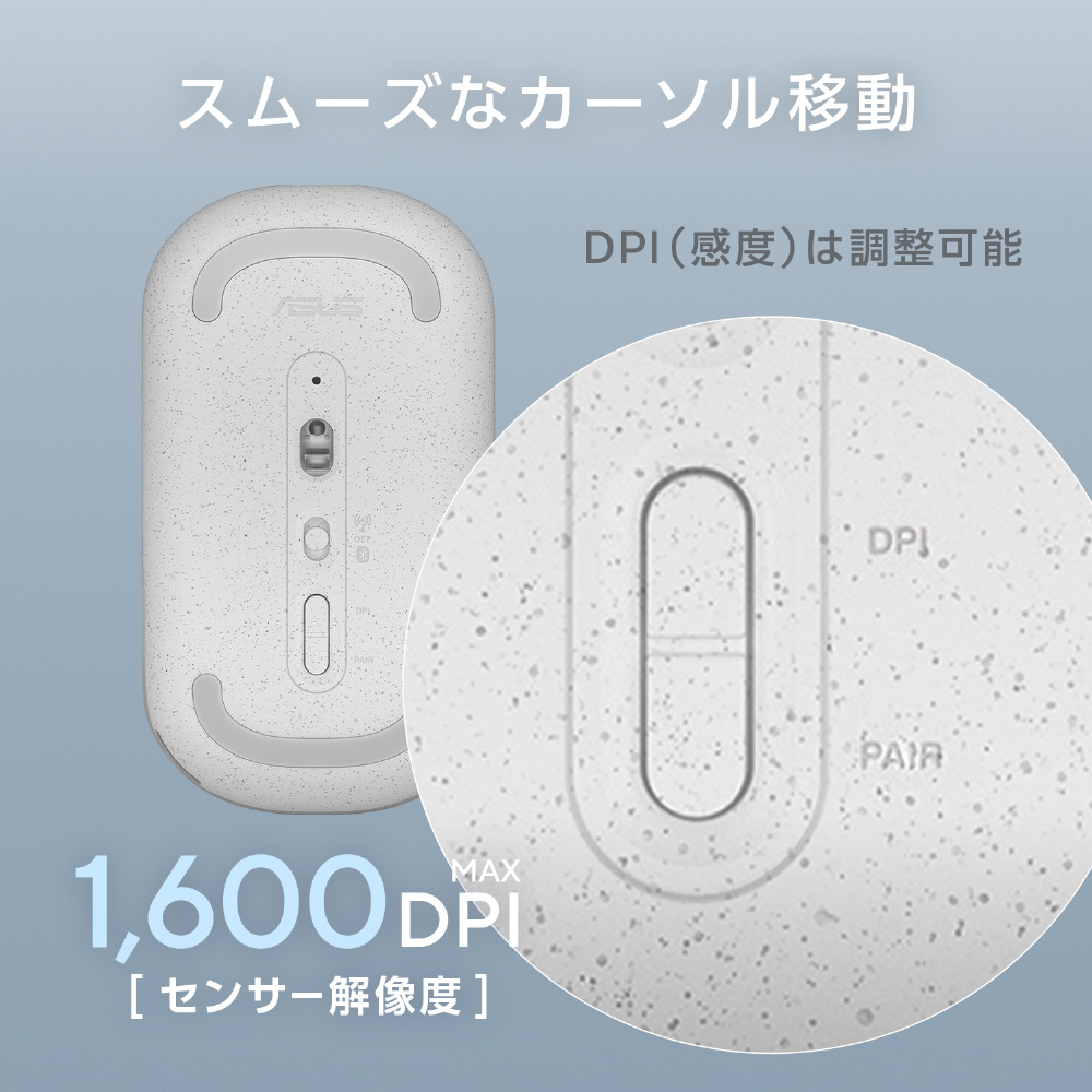 底面には低摩擦のPTFEを100%使用した、ゲーミングマウスと同グレードのマウスソールを使用しています。そのため滑りが良く、どんな場所でもスムーズな操作が可能です。また、本体のDPI(感度)は変更でき、使用環境に合わせて、800dpi、1000dpi、1600dpiから選択することができます。