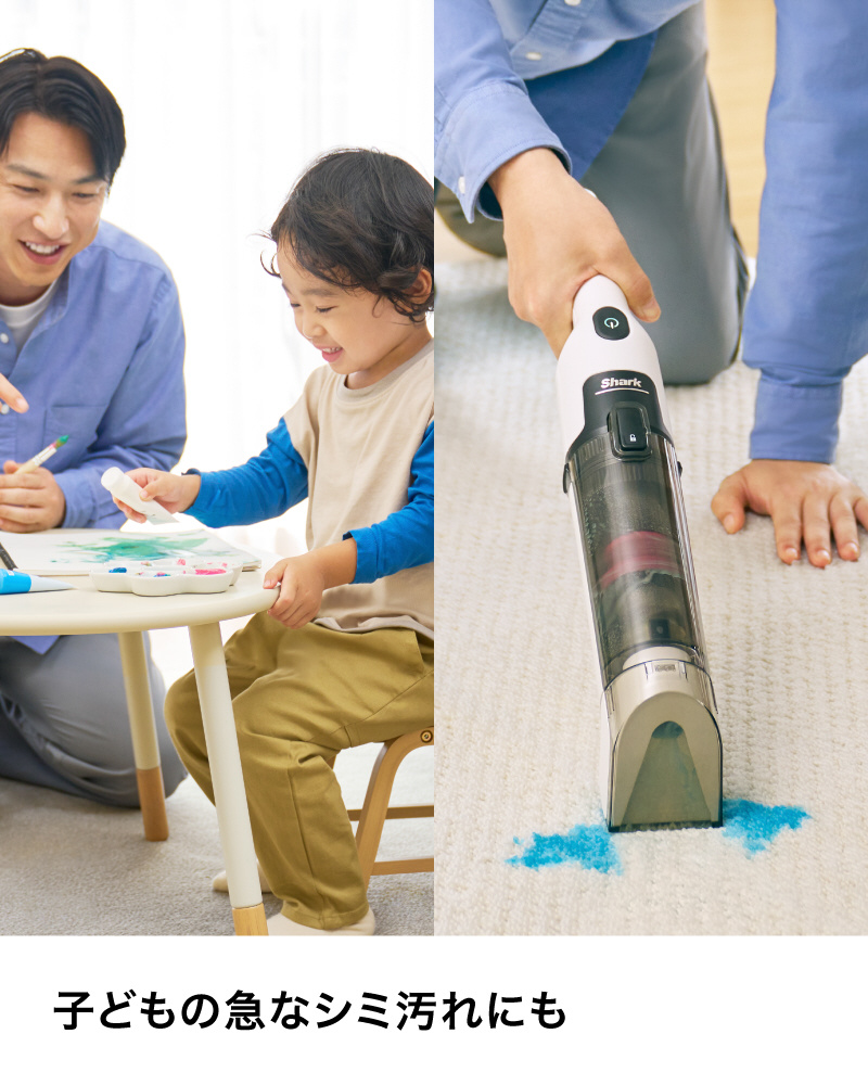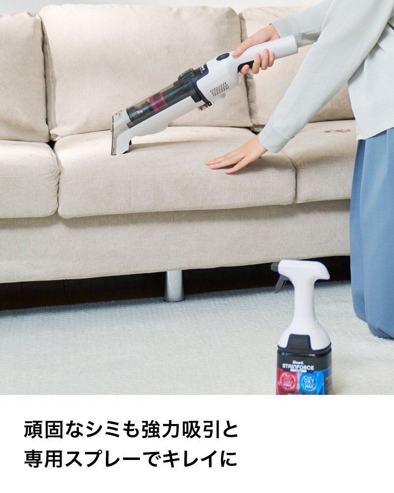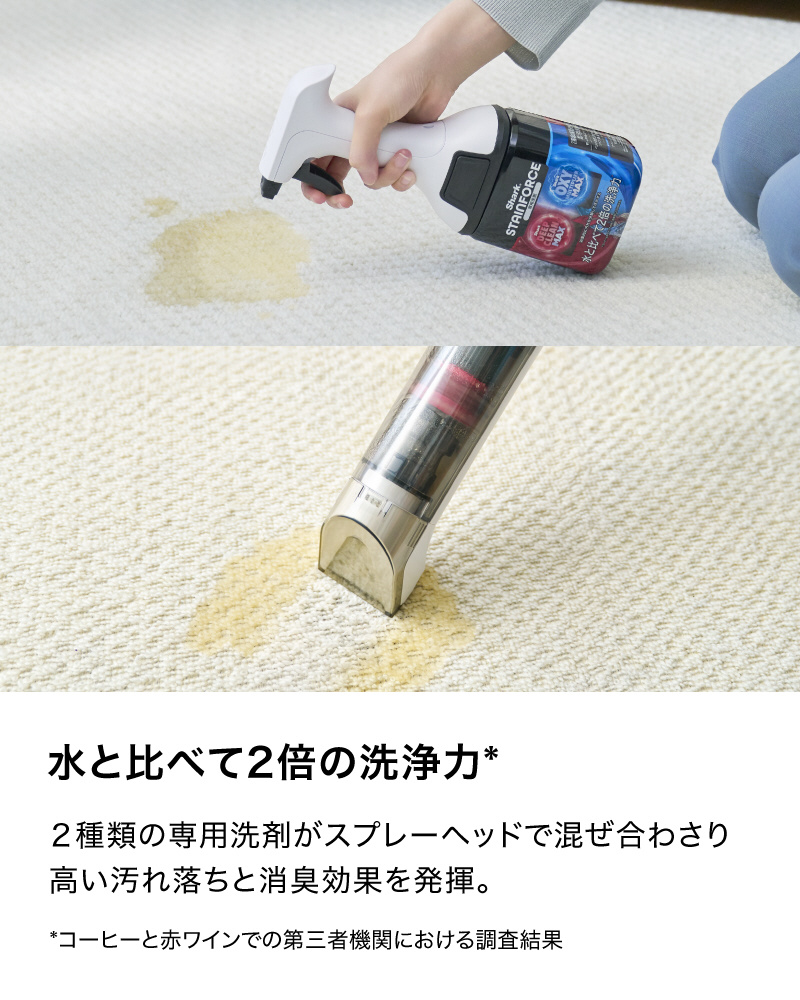 ■2種類の専用洗剤がスプレーヘッドで混ぜ合わさることにより、高い汚れ落ちと消臭効果を発揮。水と比べて2倍の洗浄力で、驚くほどキレイに