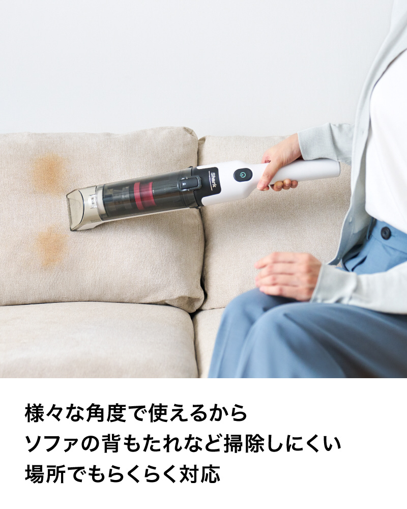 ■様々な角度で使えるから、ソファーや車のシートの背もたれなど、普段掃除しにくい場所にも対応。場所によってアタッチメントを付け替える煩わしさもありません