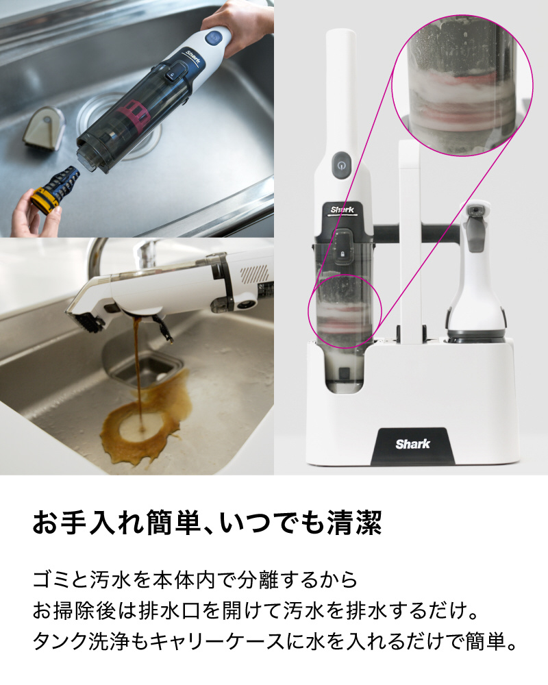 ■ペットの毛やゴミをしっかり吸引し、ゴミと汚水を本体内で分離するからお手入れが楽。アクセサリーや汚水タンクは水洗い可能で衛生的
