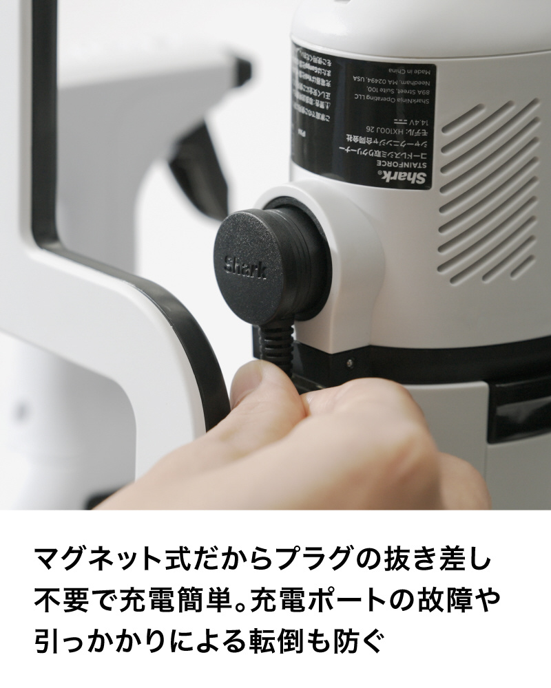 ■マグネット式の充電パッドでプラグを抜き差しする手間がなく、充電ポートの故障も防げる。万が一コードにひっかかった時もマグネットが外れるので安全