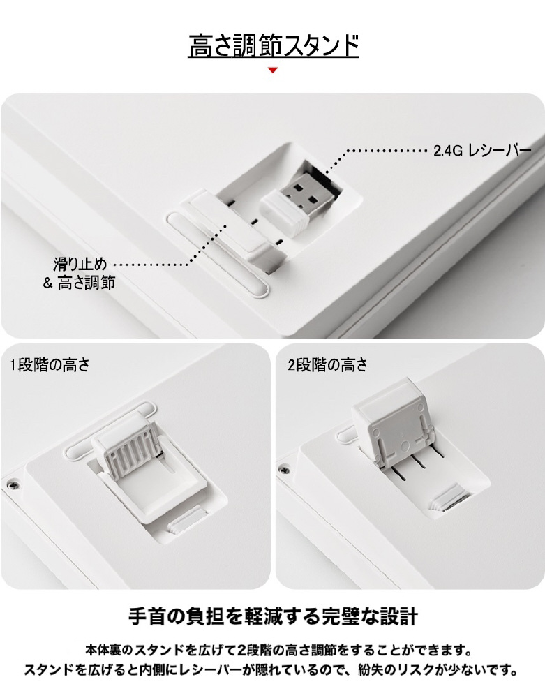 本体裏のスタンドを広げて2段階の高さ調節ができます。最大6度のタイピング角度を調整でき、手首への負担を軽減します。またキープロファイルは使用者が最も楽な姿勢でタイピングできるようにCHERRYプロファイルを採用しています。