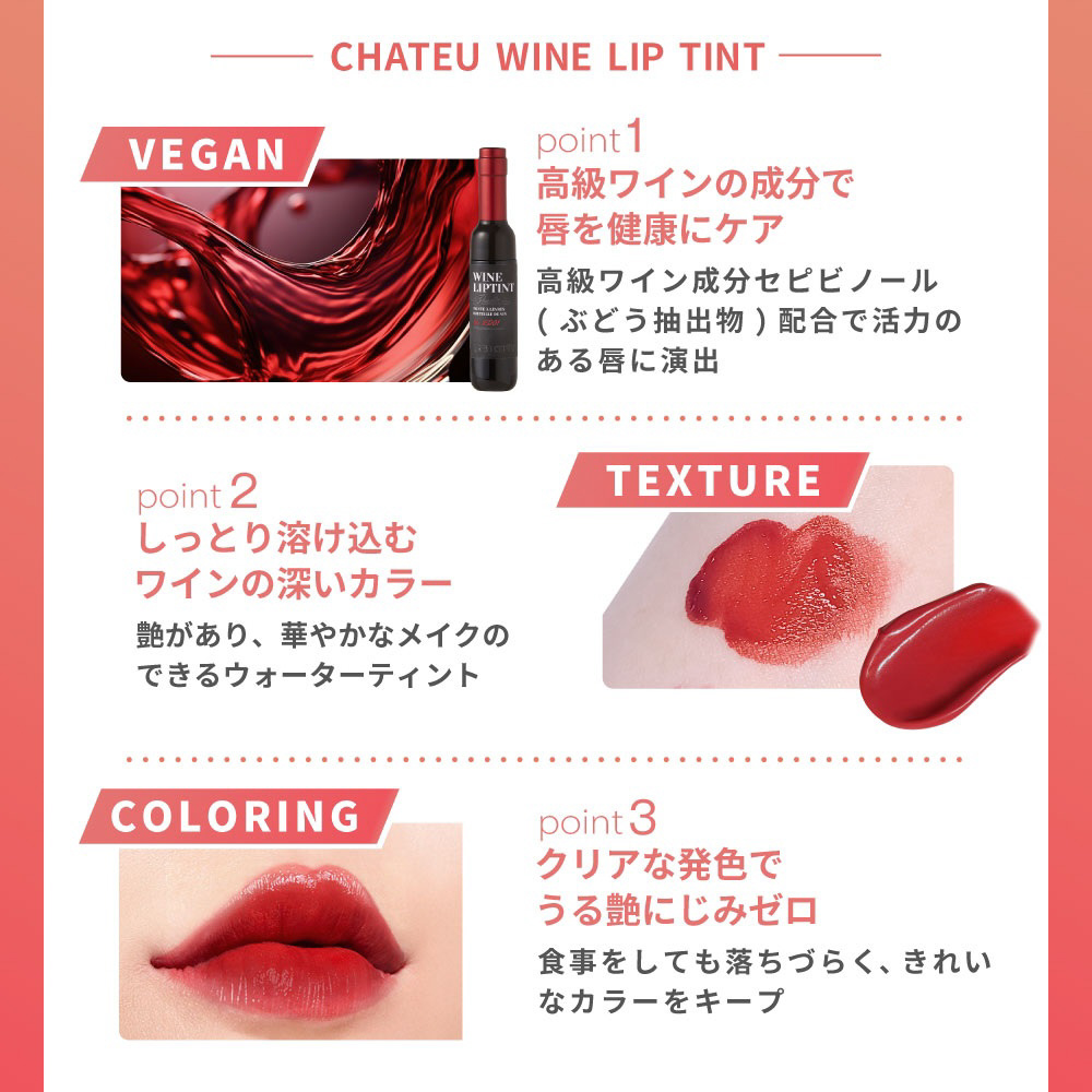 韓国発!高級ワインに含まれる美容成分を贅沢に配合し、乾燥しやすいクチビルをやさしくケアするリップアイテム。豊かな潤いとツヤを与え、思わず触れたくなるようななめらかで健康的な仕上がりへ導きます。さらに、まるでワインボトルを思わせるエレガントなパッケージは持っているだけで気分を高めてくれるデザイン。