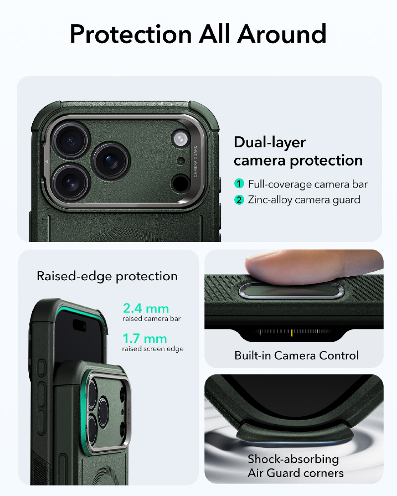 革新的なカメラコントロールボタンを専用カバーで守りながら、指先に伝わるプロ級の操作感をそのまま体感できます。スライド時の滑らかな動きから押圧時の確かな反発感まで、本体と遜色ない精密なタッチレスポンスを実現します。ボタン周辺の隙間を完全に封鎖する設計で、ほこり侵入を徹底シャットアウトします。精密センサーを埃のストレスから守り、シャッターチャンスを逃さない快適操作を長く支えます