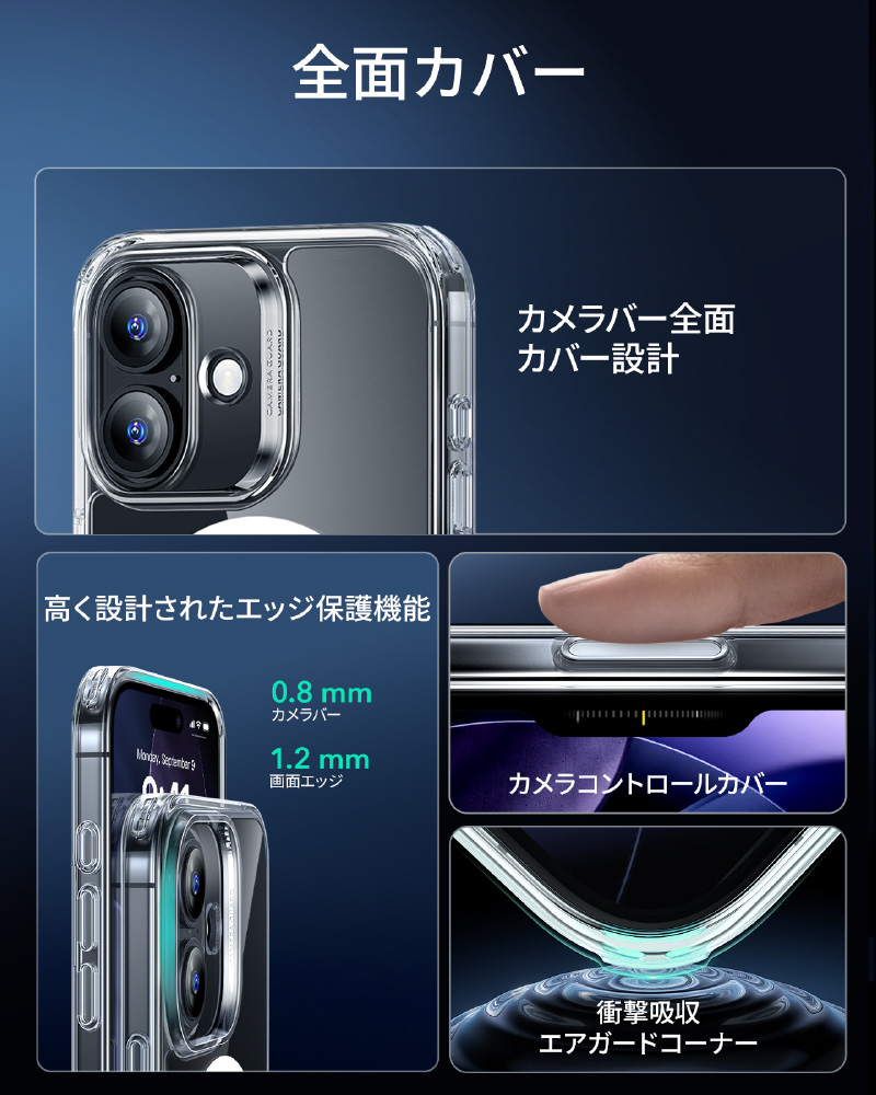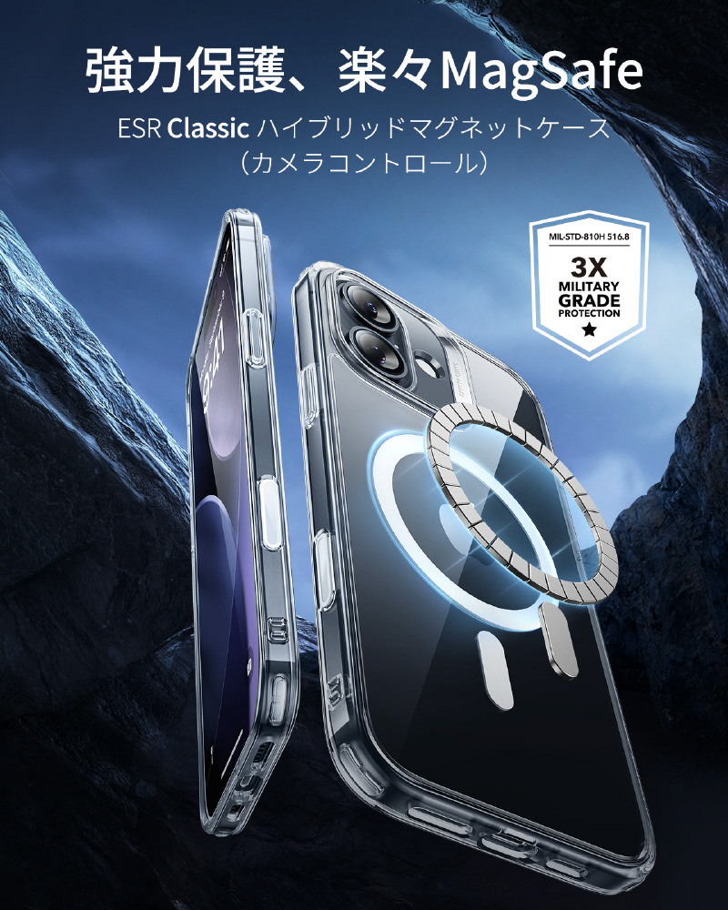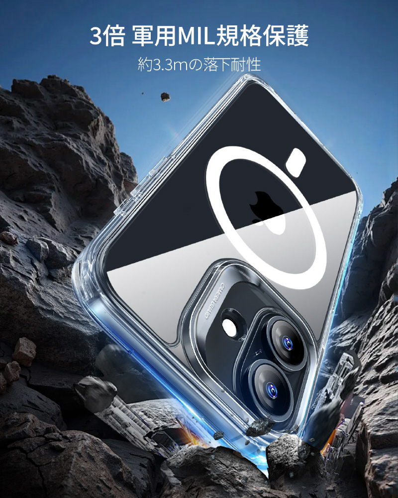 米軍規格MIL-STD-810Hの落下試験に合格したエアガードコーナー(認証番号:GZMR231203686802)を採用します。コンクリートへの高さ3.3メートル落下テストにも耐える設計で、駅のホームでの使用や登山中など、アクティブなシーンでも安心できます。うっかり落とした時も、大切なiPhoneを確実にプロテクトします