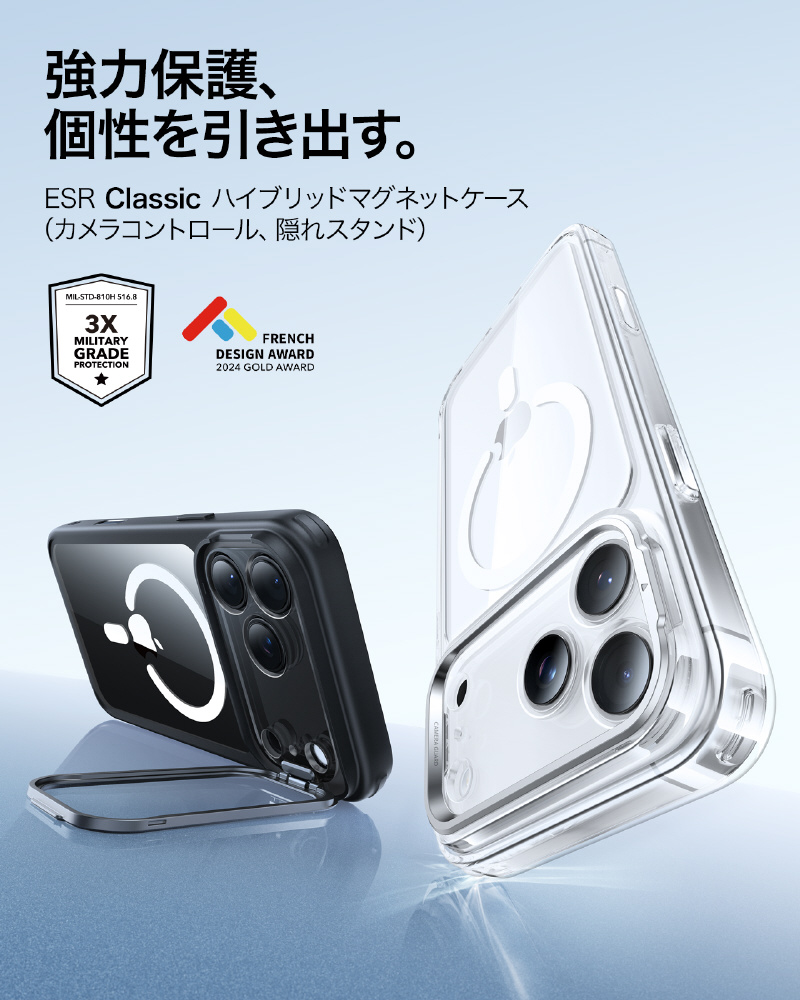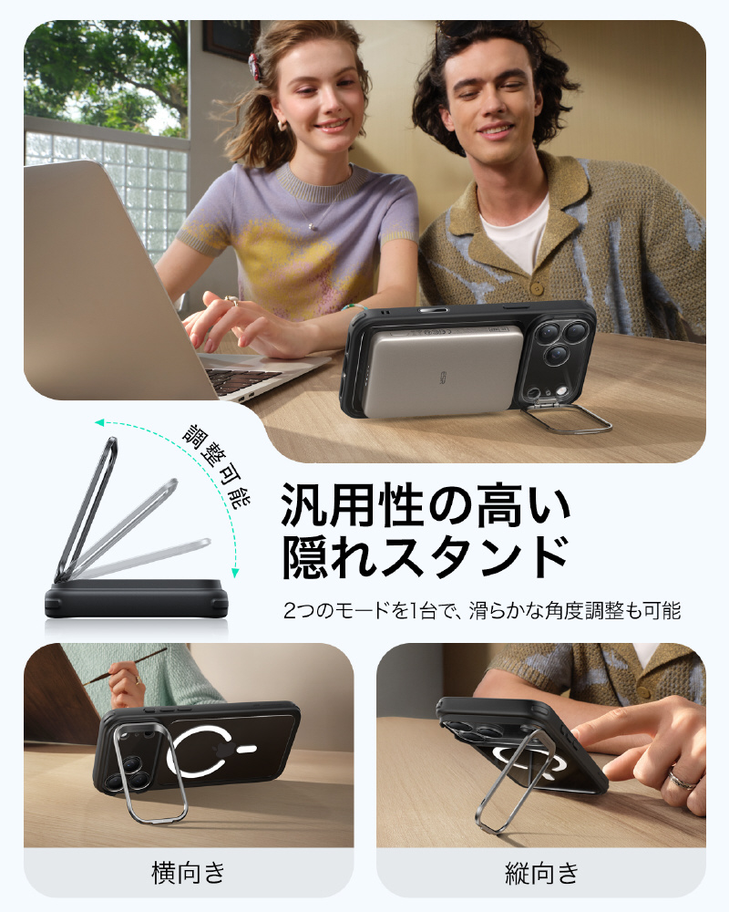 「スタンドケース、便利だけど邪魔じゃない?」いいえ、このスタンドは隠蔽式です!必要な時だけに出し、縦位置・横位置を自由自在に調整可能で、YouTube視聴はもちろん、TikTokやInstagramの縦長動画のライブ配信にも最適です。この独創的なデザインは、フレンチデザインアワード2024ゴールド賞を受賞しました!スタンドを使いながら同時にMagSafe充電もでき、革命的な便利さです