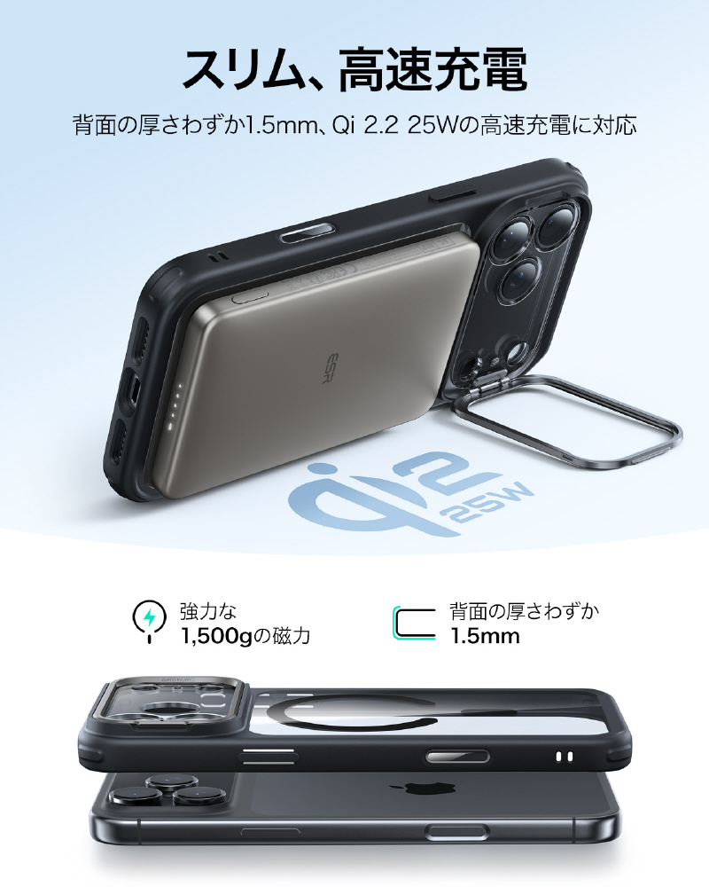 内蔵のN52M強力磁石と薄さ1.5mmのバックパネルが、最大25W充電対応の高速かつロスなしのMagSafe充電を実現します。さらに、このiPhoneケースは厳選素材と独自の抗黄変配方で、複合バックパネルと表面4H硬度処理により、長期間使用でも黄ばみやキズ(鍵やコインなども)に強く、いつまでも新品のような美しさを保ち続けます