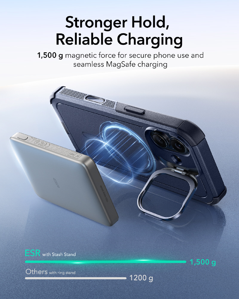 1,500gの保持力を持つ強力な内蔵マグネットが、より速く、より簡単な瞬間吸着ワイヤレス充電と、あらゆるMagSafeアクセサリーへの安全な磁気吸着固定を可能にします。