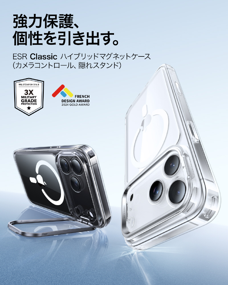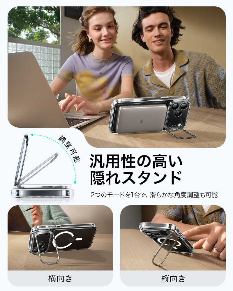 「スタンドケース、便利だけど邪魔じゃない?」いいえ、このスタンドは隠蔽式です!必要な時だけに出し、縦位置・横位置を自由自在に調整可能で、YouTube視聴はもちろん、TikTokやInstagramの縦長動画のライブ配信にも最適です。この独創的なデザインは、フレンチデザインアワード2024ゴールド賞を受賞しました!スタンドを使いながら同時にMagSafe充電もでき、革命的な便利さです