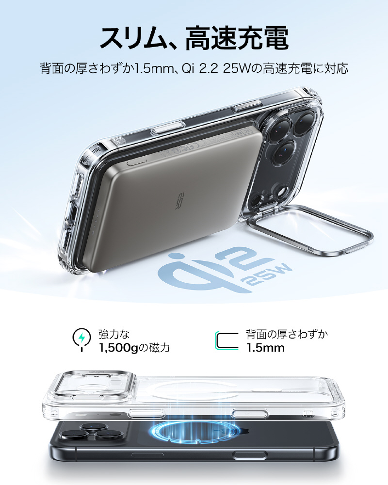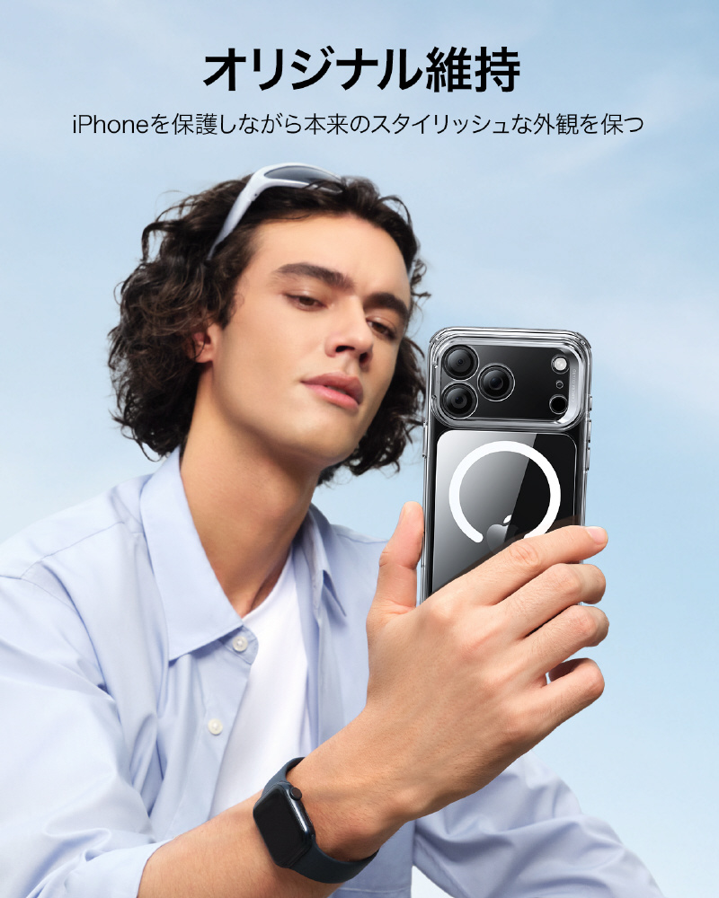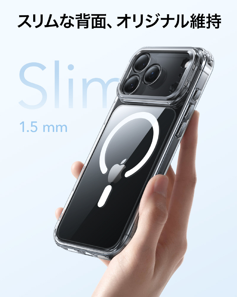 内蔵のN52M強力磁石と薄さ1.5mmのバックパネルが、最大25W充電対応の高速かつロスなしのMagSafe充電を実現します。さらに、このiPhoneケースは厳選素材と独自の抗黄変配方で、複合バックパネルと表面4H硬度処理により、長期間使用でも黄ばみやキズ(鍵やコインなども)に強く、いつまでも新品のような美しさを保ち続けます
