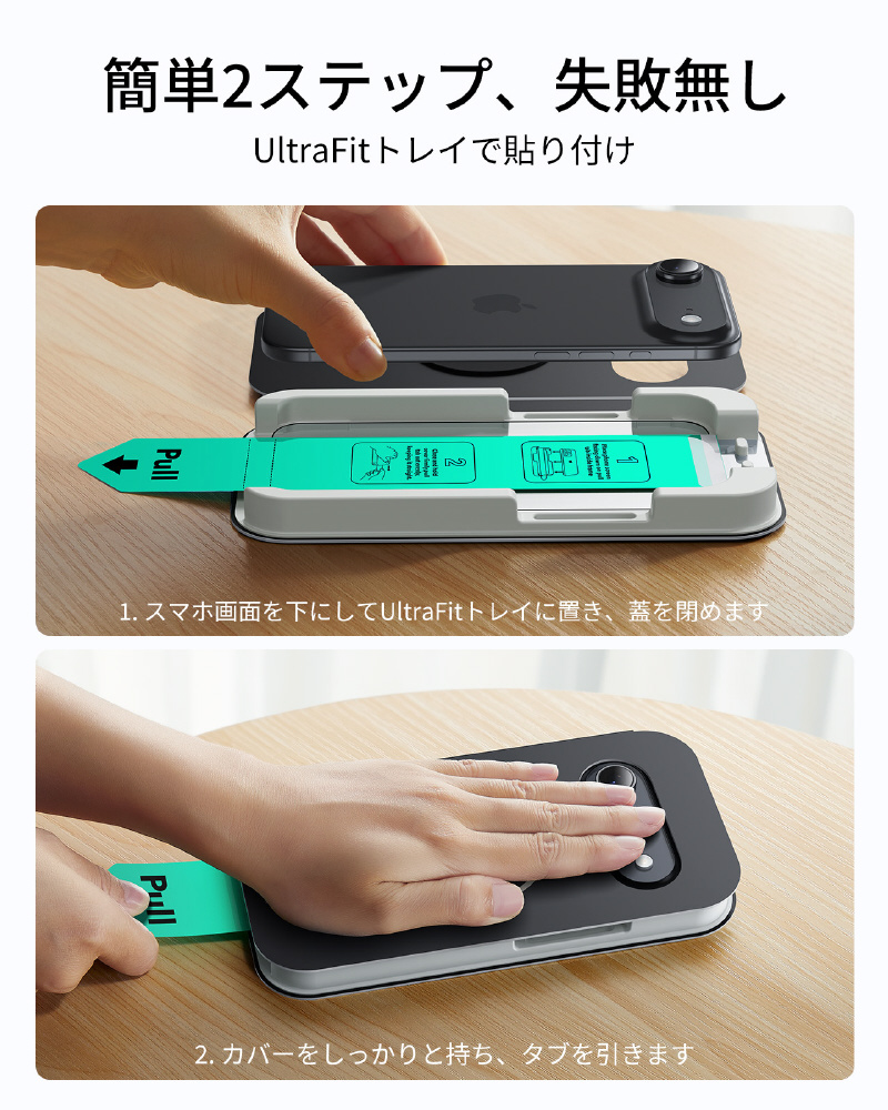 専用貼り付けツールであるUltraFitトレイとクリーニングキットが付属しており、気泡のない素早い保護フィルム貼付けが行えます。説明書に目を通してから、貼り付けツールをご利用下さい。