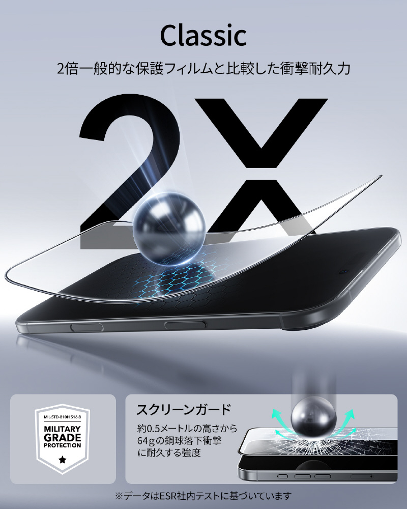 最大15kgの耐衝撃性を備える超タフな強化ガラスは、落下、衝撃、傷に耐え抜きあらゆる日常使用シーンから画面を守り抜きます。