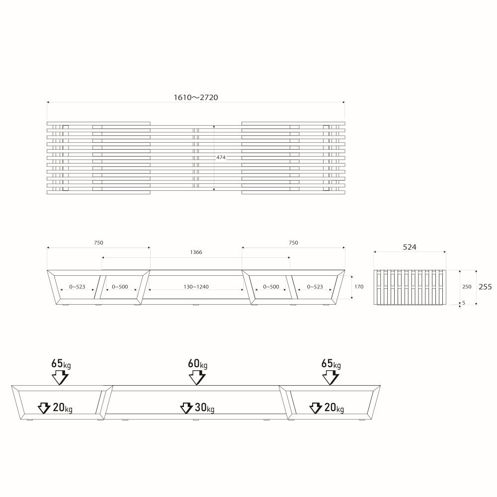 外形寸法:幅2720〜1610mm × 奥行 524mm × 高さ255mm
