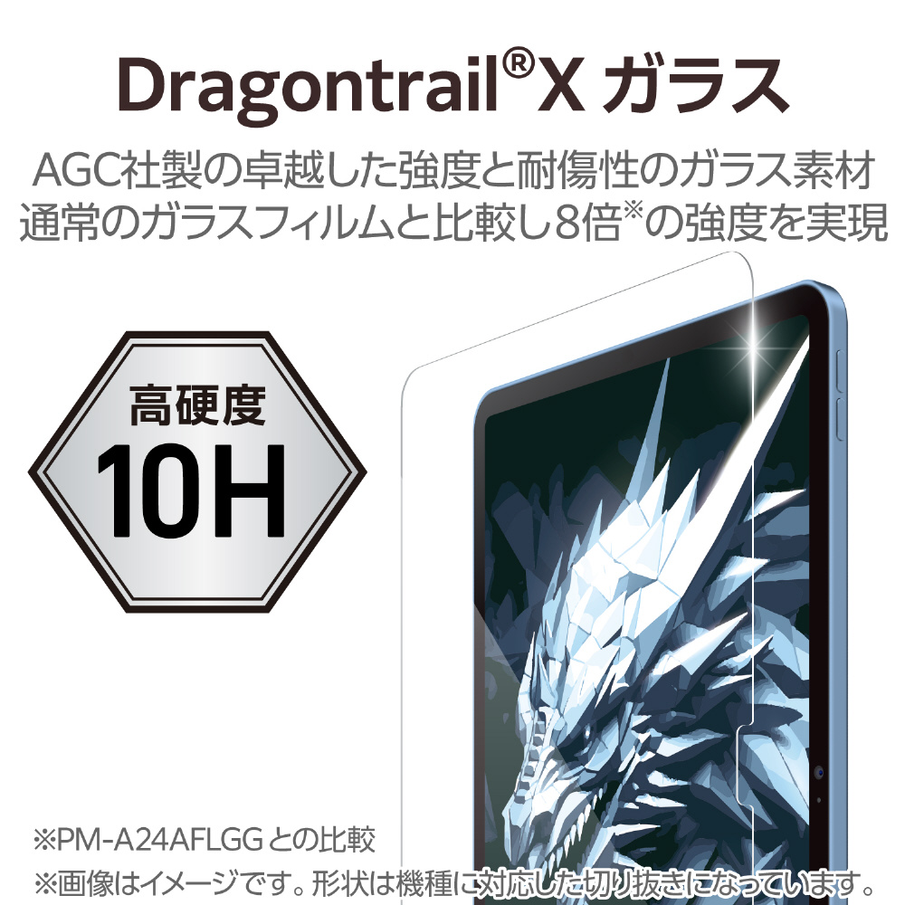 通常のガラス(ソーダライムガラス)に比べ、8倍の強度を誇る旭硝子社製特殊ガラス“Dragontrail X”を採用した保護ガラス。