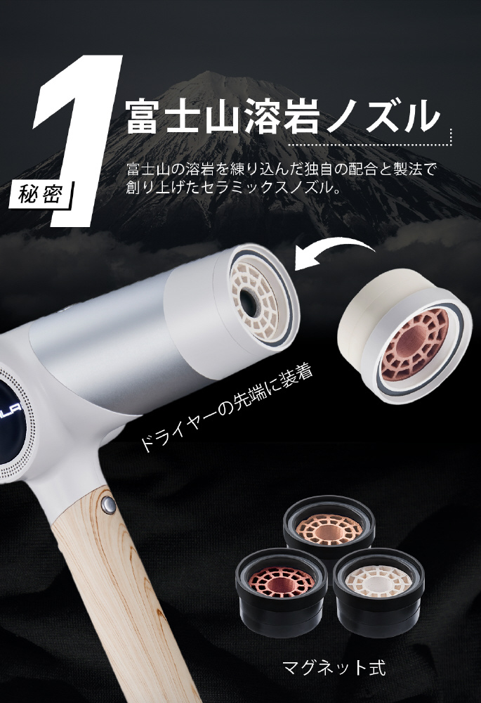 だからこそ実現できる速乾性。根元までしっかり、効率的に乾かすことが可能。更に富士山溶岩セラミックスノズルの力と多機能で潤いと艶を閉じ込め、多様な髪質に合わせた、最適なヘアドライを実現します。