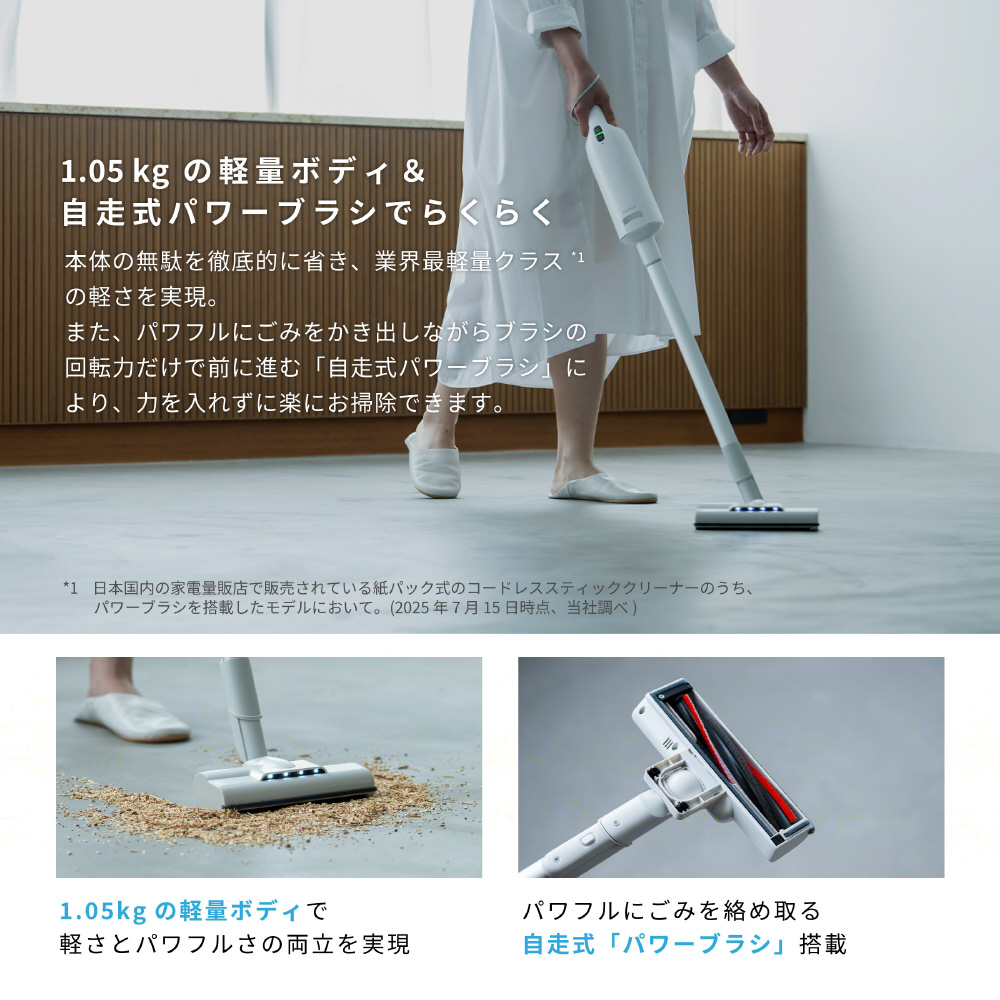 *日本国内の家電量販店で販売されている紙パック式のコードレススティッククリーナーのうち、パワーブラシを搭載したモデルにおいて。(2025年7月15日時点、当社調べ)