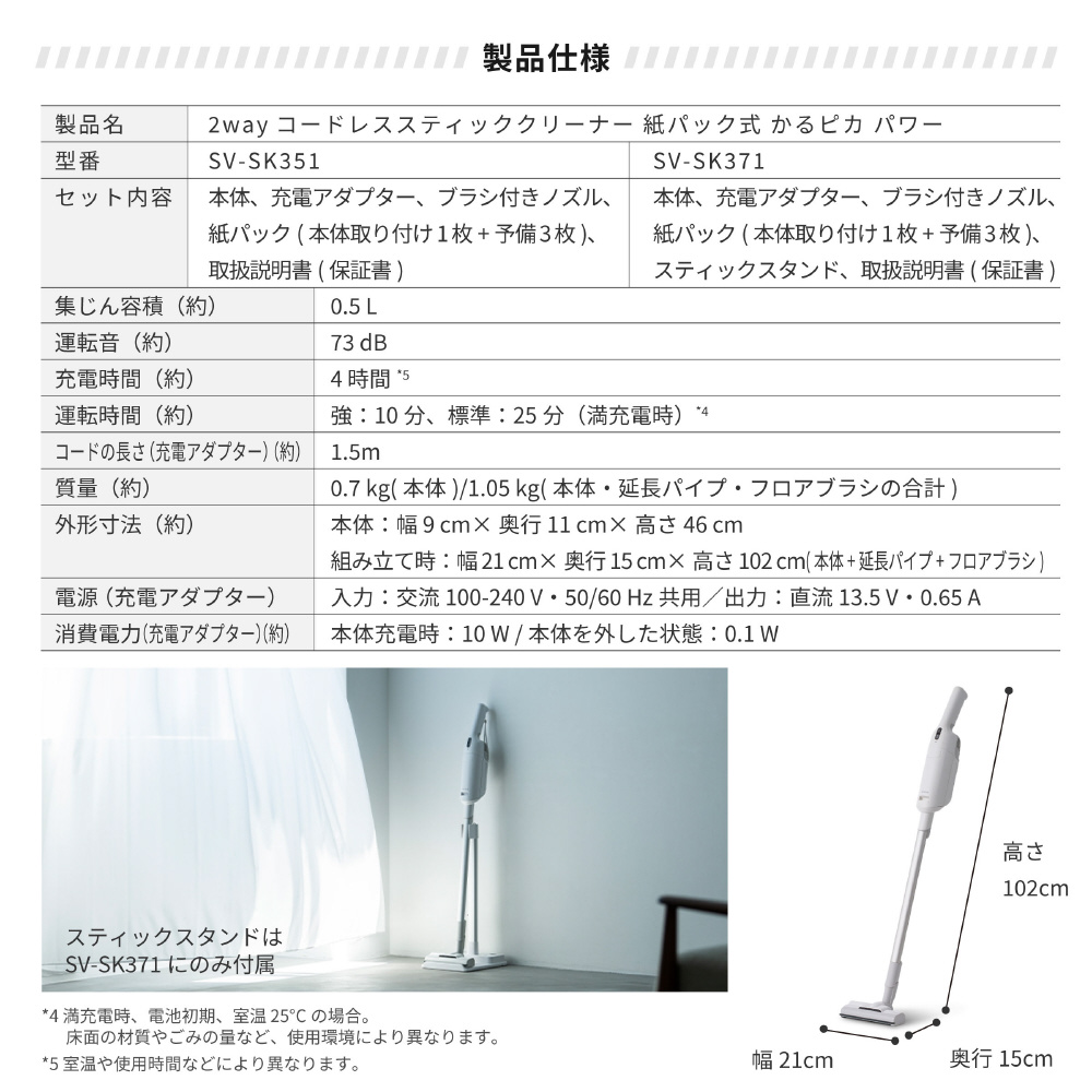 | 商品名 | 紙パック式コードレススティッククリーナー かるピカパワー siroca ホワイト SV-SK371 [紙パック式 /コードレス] |