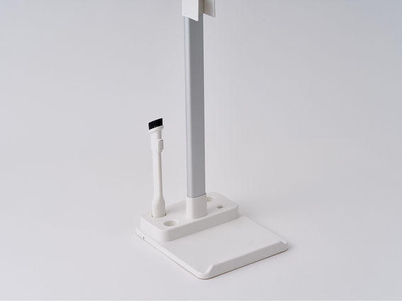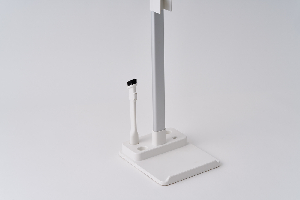 本体を立てたまま収納でき、充電アダプターを取り付ければ同時に充電もできるスティックスタンド付き。