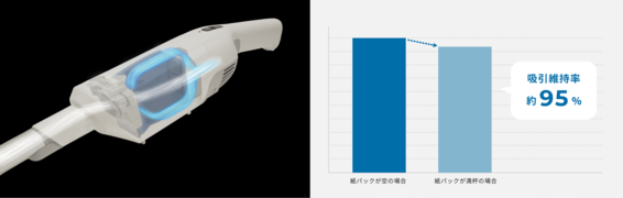 *[測定方法]満充電時、強モードにて、紙パックが空の場合と満杯の場合とで吸引力を比較。(自社調べ)。記載の吸引維持率は当社基準による自社測定値です。実使用環境・吸引物の種類により異なります(参考値)