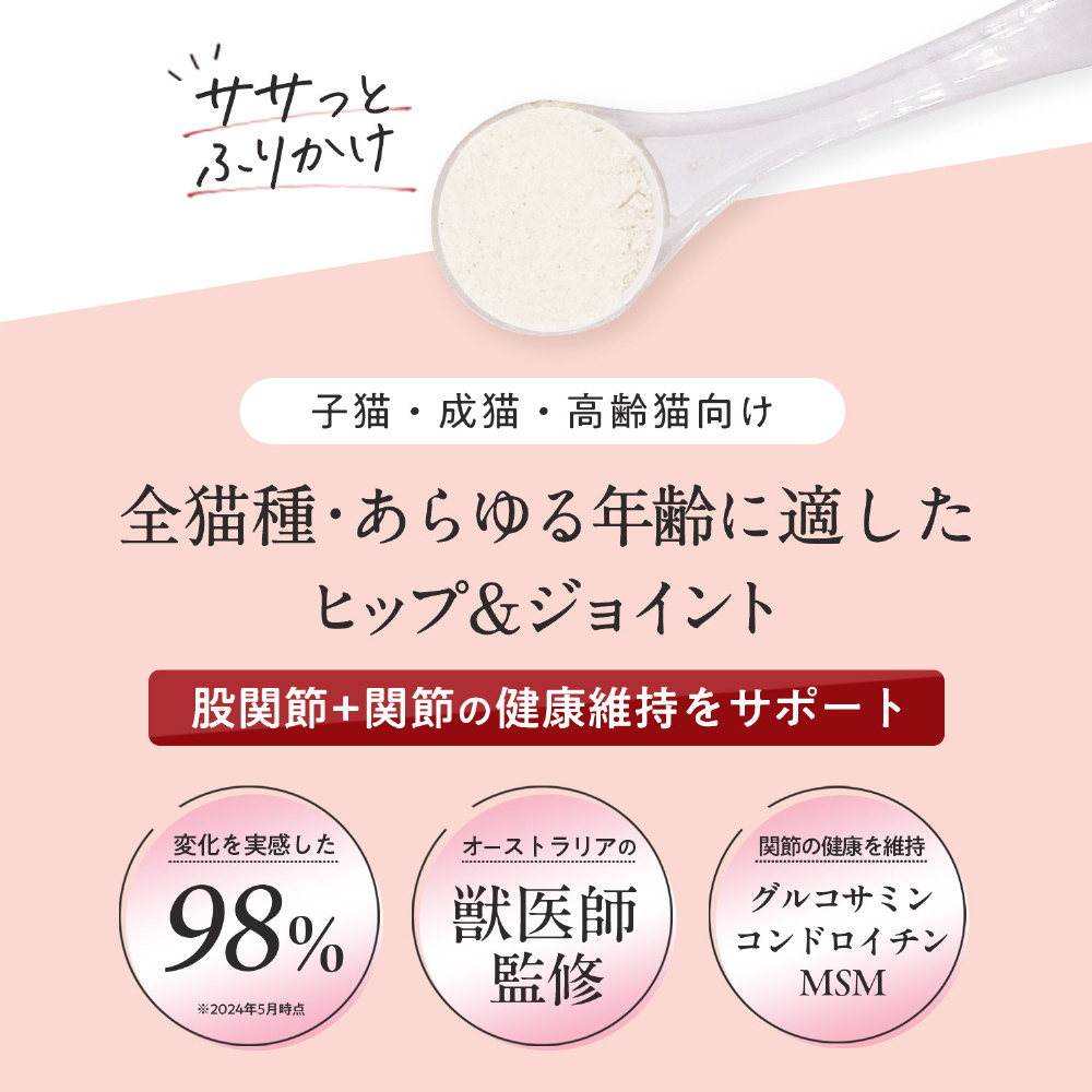 ・グルコサミンやコンドロイチン、MSM(メチルサルフォニルメタン)などの成分を摂取することで愛猫の健康を維持し、股関節と関節の健康維持をサポートします。